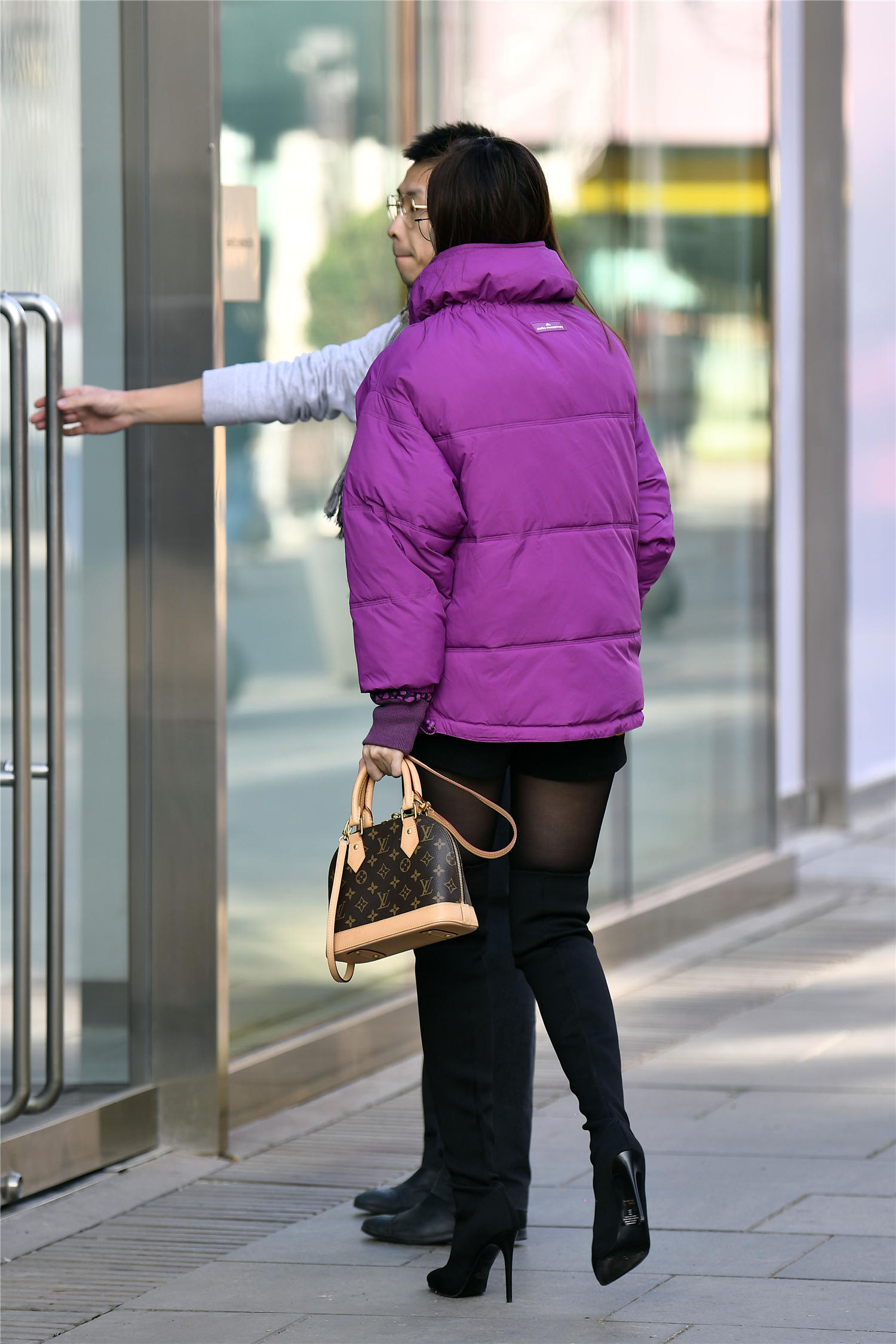 时尚的姑娘,更喜欢搭配出自己的味道,到了冬天,要穿出自己的修身效果,看一下这位美女的穿搭,黑色丝袜,非常厚实,所以色彩会暗一些,搭配一双细高跟过膝长靴,显得腿特别长,还有着纤细笔直的效果,衬托出精致的身材,黑色修身短裤,是比较常见的搭配组合,一款紫色的短款羽绒服,增加色彩,也显得更加保暖。