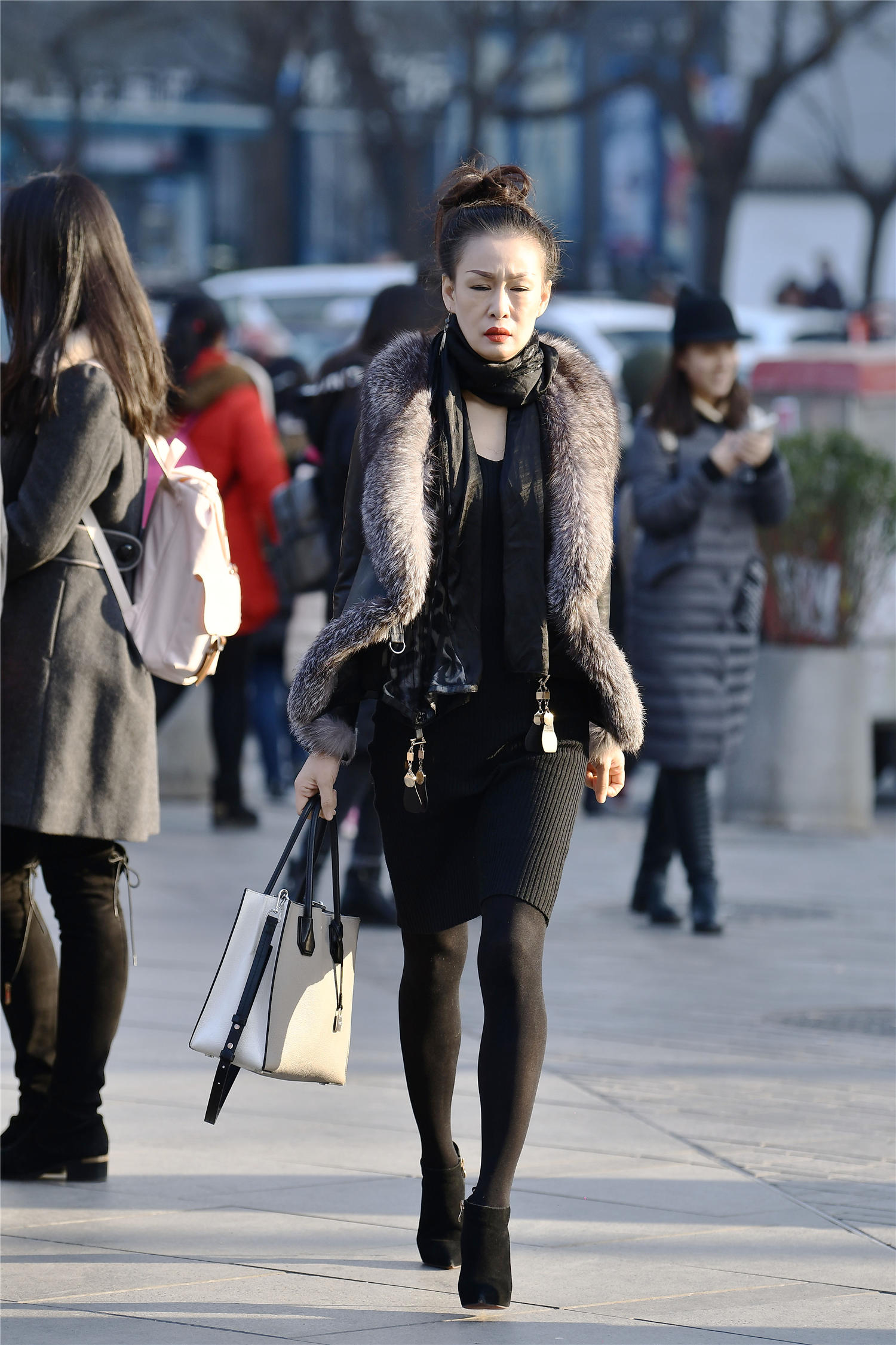 对于喜欢搭配的美女来说,只要搭配,不要在意自己的年龄,穿出自己的时尚味道就好,看一下这位美女,穿着皮草的外套,非常贵气的感觉,短款的设计,非常有气质,黑色竖条纹的紧身裙,到膝盖上面一点,黑色丝袜,非常厚实的款式,搭配一双尖头细高跟踝靴,衬托出她的身材,也搭配出很精致秀气的感觉。