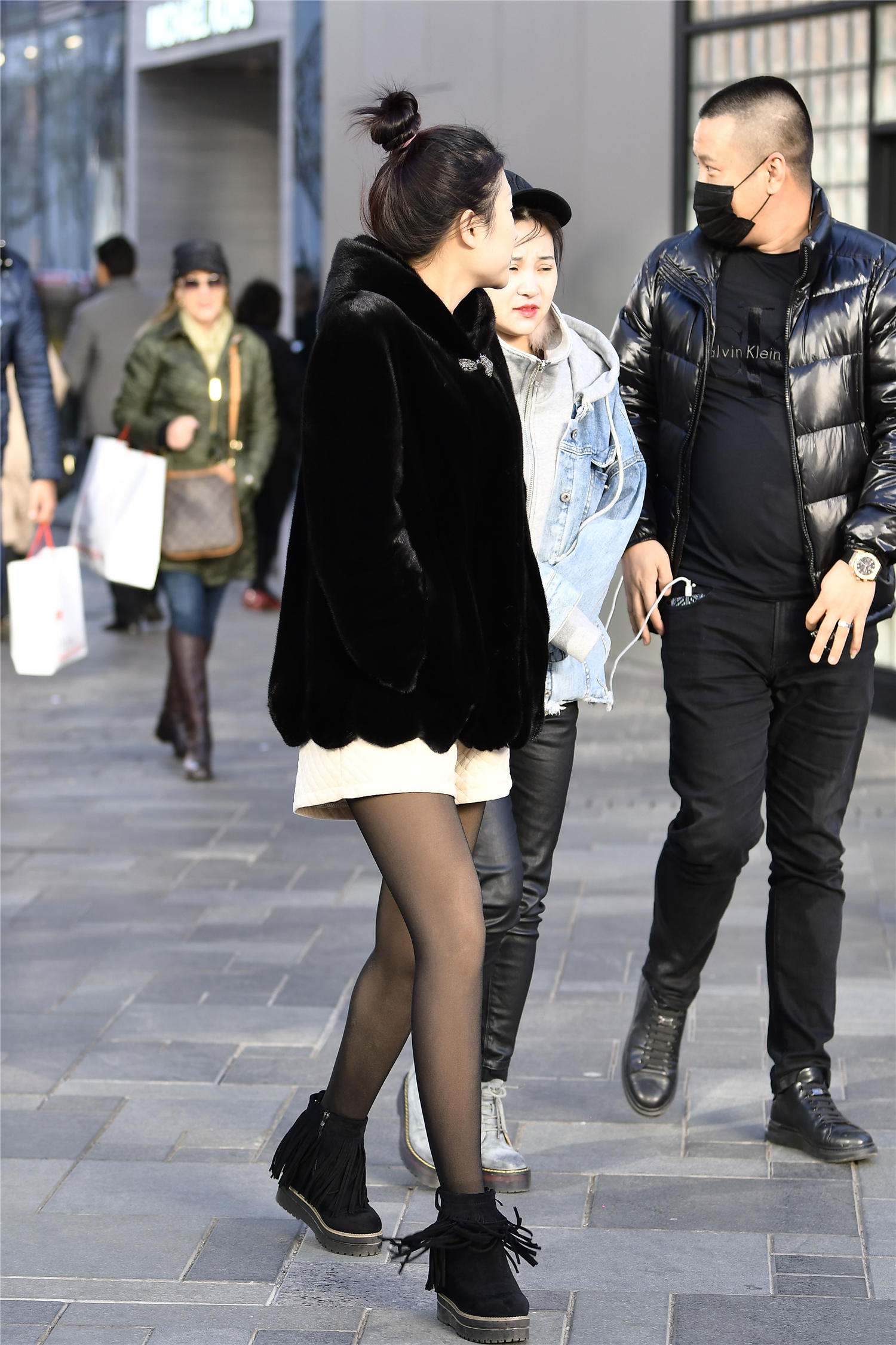 有些姑娘也会穿着平底的靴子,这样会搭配出一点显年轻的效果,看一些这位姑娘的穿搭,黑色丝袜,搭配黑色内增高的短靴,靴子上面的流苏设计,也显得有些小女生的感觉,白色短裤被她的黑色貂绒外套遮住,这样穿搭有层次感,虽然以黑色为主,有着渐变的效果,搭配出自己的时尚感觉。