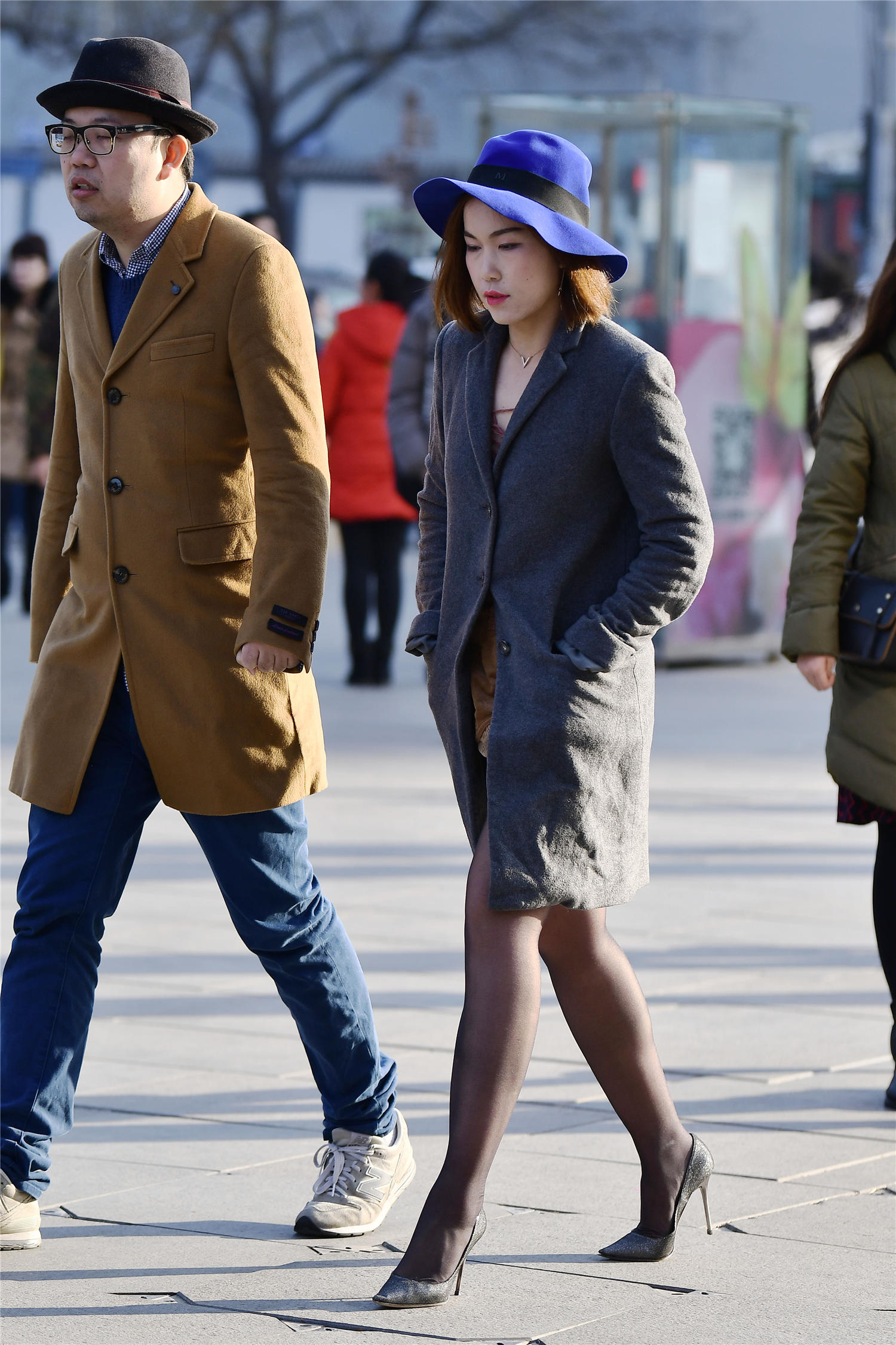冬天穿着黑色丝袜,要搭配一双高跟鞋还是平底鞋,可以年轻还是成熟,这位美女穿着深灰色的风衣,立肩设计,非常有气质的感觉,衣摆到膝盖位置,露出小腿,黑色丝袜,和一双黑色尖头细跟单鞋,穿出很时尚的效果,也衬托身材高挑,还有着显瘦的效果,一顶宝石蓝的大檐帽子,搭配出很好看的效果,也为冬季增加色彩。