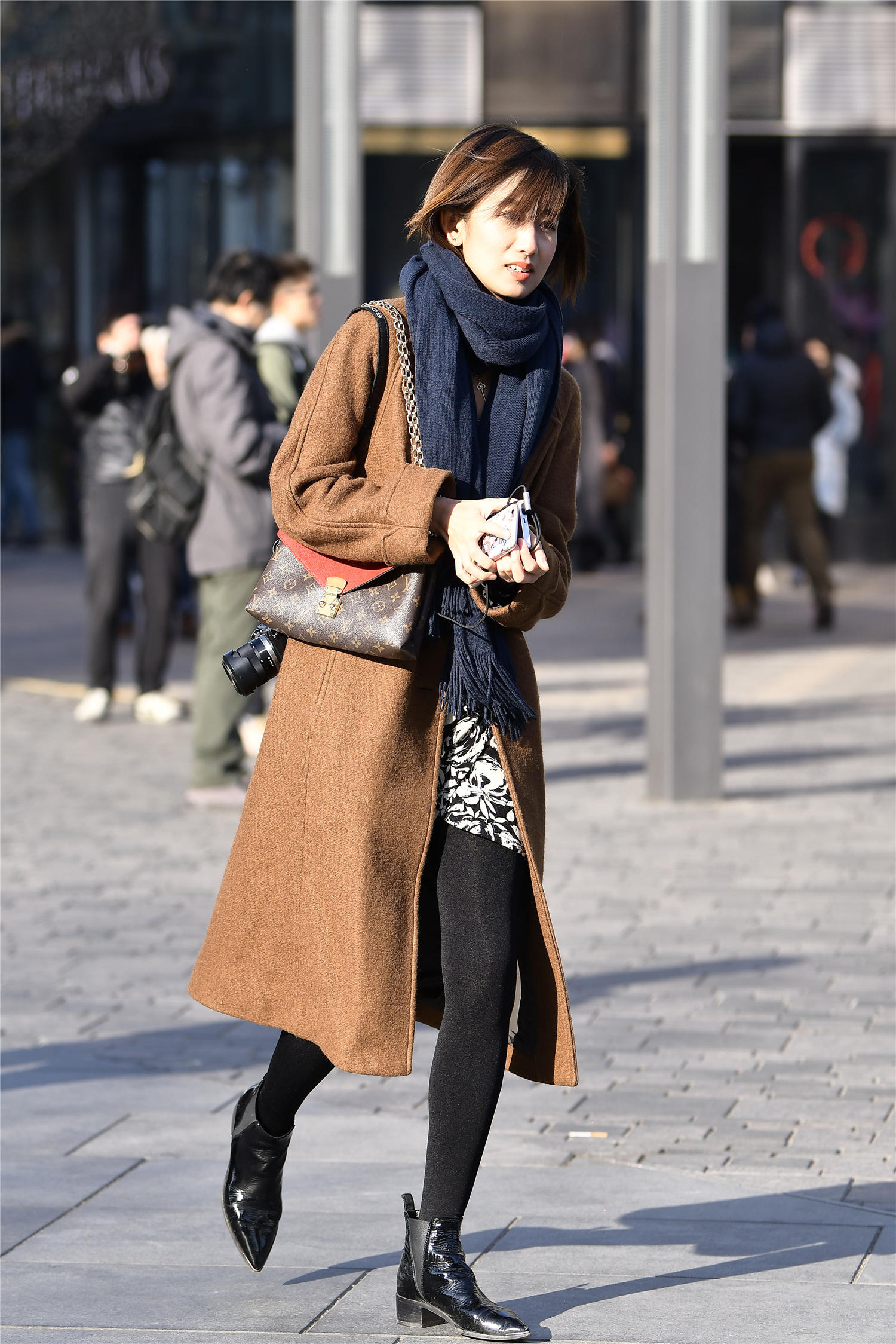 对于时尚姑娘来说,搭配出符合自己年纪的服装,就会展现出精致的感觉,简约的搭配,不要特别繁琐的穿搭,这位美女选择一款棕色的呢子大衣,敞开怀,可以展示内搭,深蓝色的围巾,起到很好的保暖效果,黑白色纹理的裙子,不是很长,黑色亮光的丝袜,非常厚实的设计,搭配一双尖头粗跟短靴,穿出不一样的时尚味道。
