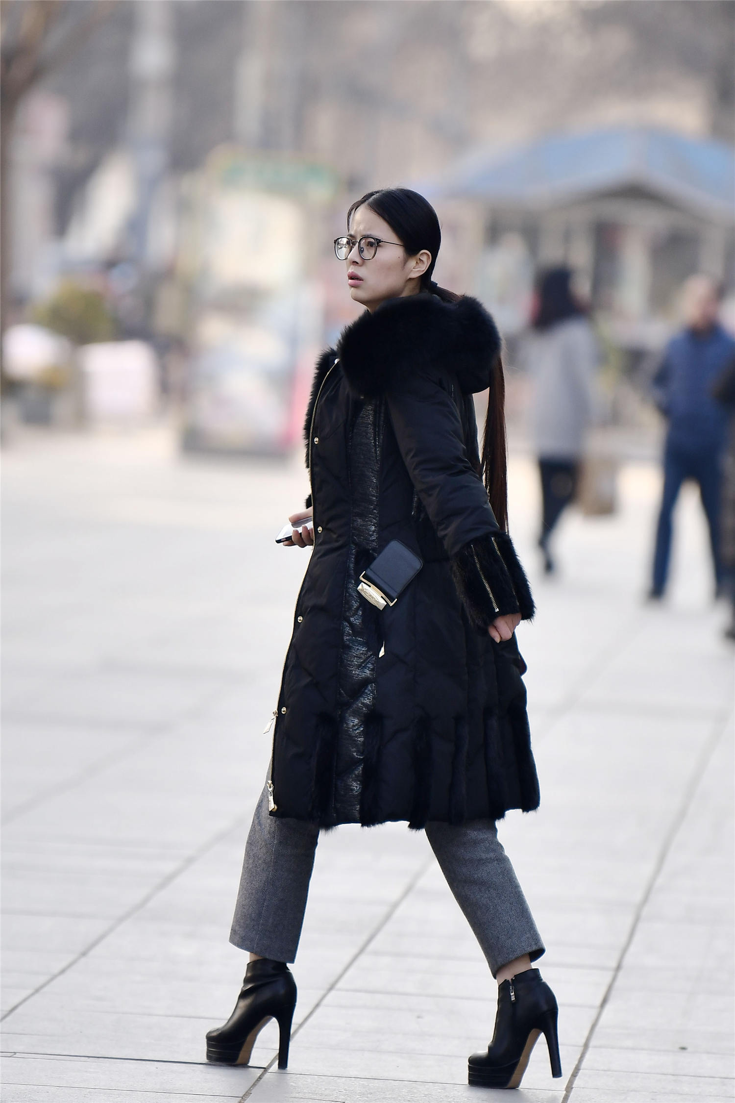 冬天穿着短靴的姑娘也很多,很多人会选择高跟的款式,这样搭配出很有层次效果,也穿出自己的味道,这位美女选择一双黑色的踝靴,鞋跟粗一些,前面有着防水高台,非常好看,深灰色的裤子,刚好与脚踝的位置,一款灰色的大衣,非常保暖,敞开怀,这样会穿出很有风度的效果,也搭配出自己的精致感觉来,穿出气质美。