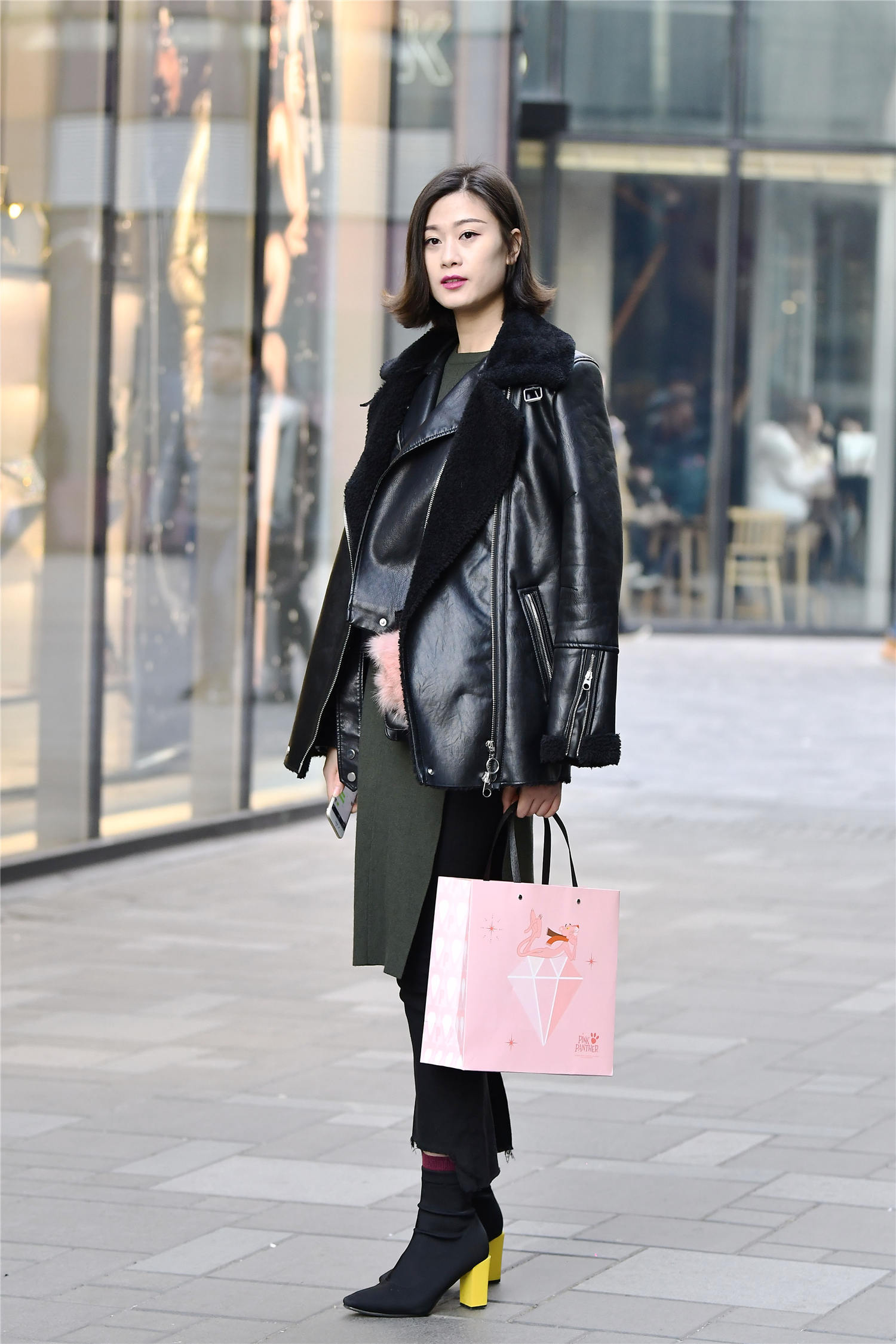 到了冬天,很多姑娘依旧会搭配出很精致的效果,在时尚街区有很多漂亮的姑娘在逛街,看一下这位小姐姐,选择以黑色为主的搭配,一双黑色尖头短靴,黄色粗跟,非常个性,增加一点色彩黑色九分牛仔裤毛边的裤脚,搭配墨绿色的筒裙,一款黑色皮夹克,非常有质感的服装,搭配出很精致的感觉。