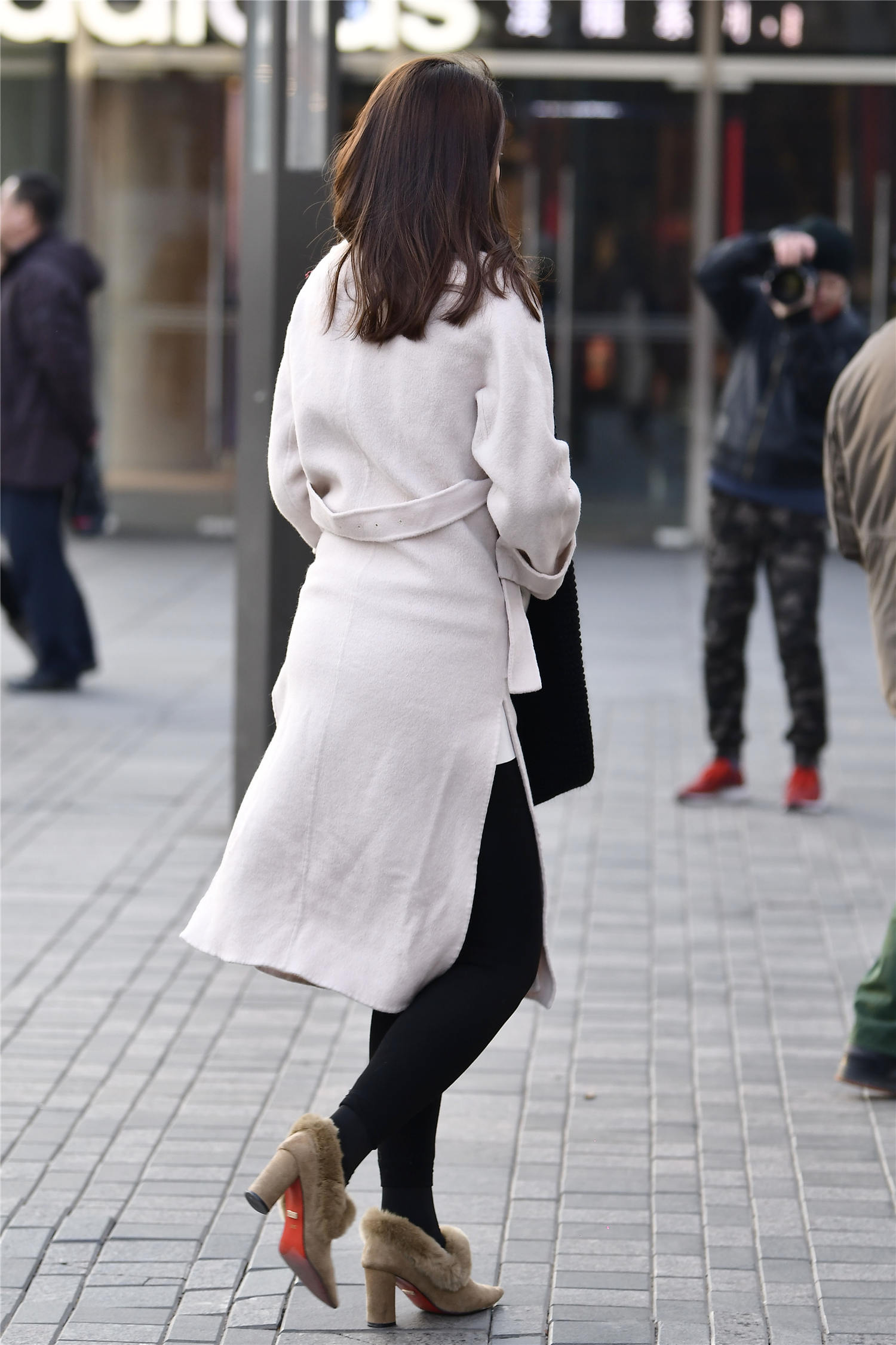 冬天穿搭,还是要以保暖位置,要穿出时尚的感觉,就要选择自己喜欢的风格,也要有自信去展示,看一下这位美女的穿搭,一双暖色的尖头粗跟踝靴,磨砂皮面,鞋口的皮草装饰,非常好看,红色的鞋底,增加色彩,黑色的打底裤,修身款式,显得身材很好,米白色的呢子大衣,非常休闲的款式,侧面开叉设计,显得简约个性。