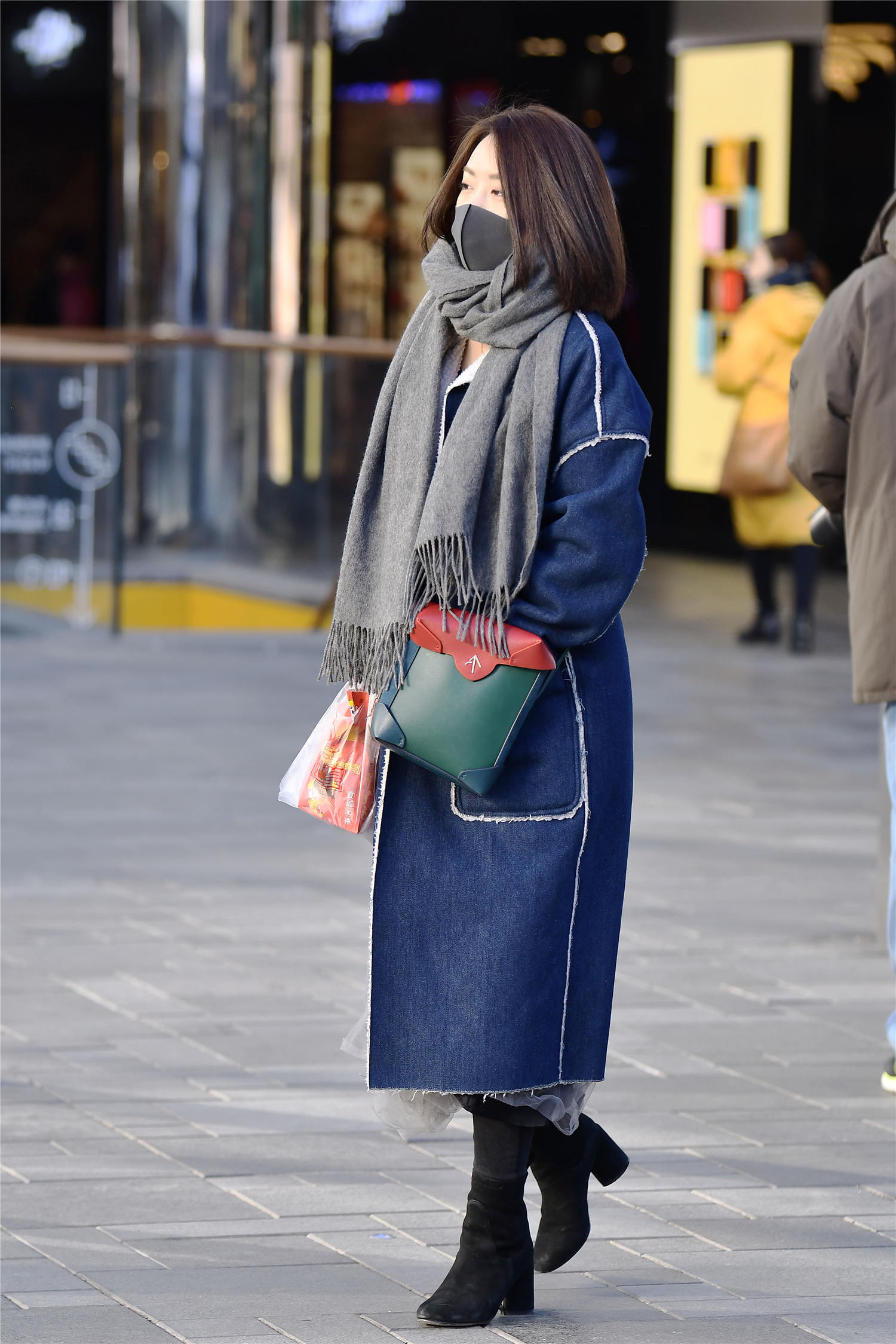 很多人喜欢穿着短靴,因为可以穿出自己的身材,搭配出自己的味道,长款的牛仔大衣,里面是羊羔毛的设计,缝合线的地方,有点白色露出来,非常有层次的效果,也有着简约的风格,一款深灰色的围巾,搭配出很精致的感觉,黑色的打底裤搭配一双黑色粗跟短靴,微胖身材,也可以搭配出很时尚的感觉,选对衣服,你就是时尚达人。