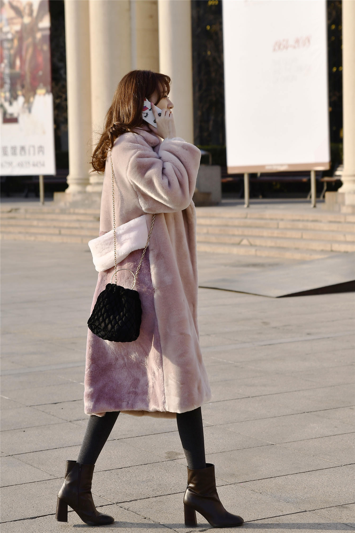 保暖和时尚兼具,就要知道怎么选择服装,选出自己的喜欢的风格,这样才会搭配出很美的效果,这位美女选择一款浅色的绒面长款大衣,非常厚实的面料,搭配出休闲,还有着保暖的效果,黑色打底裤搭配一双黑色粗跟短靴,皮质设计,非常有质感,这样就搭配出保暖还显身材的效果,也穿出简单的味道。