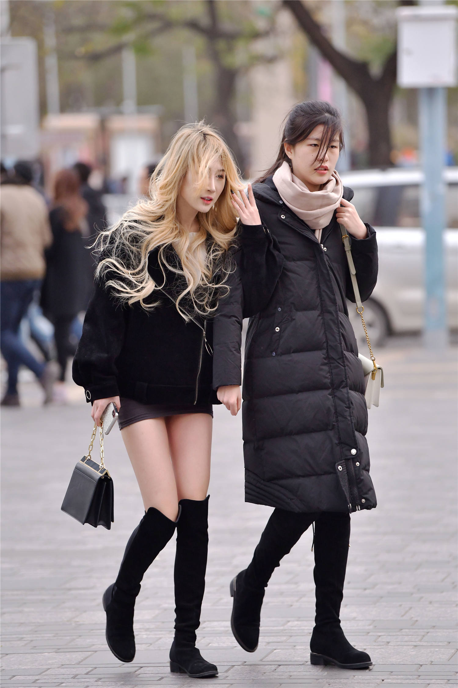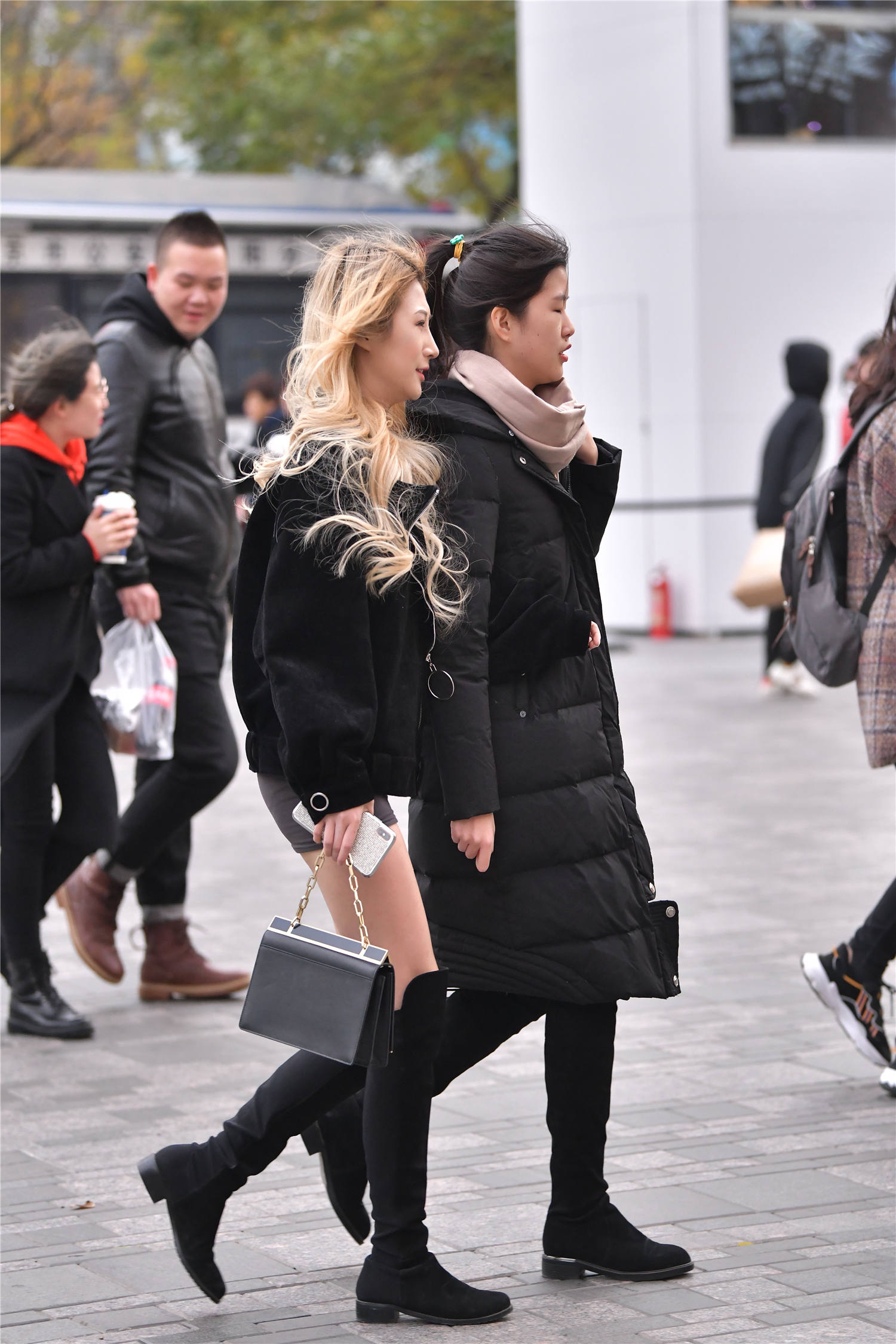 看一下这位小姐姐,敢于展示身材,黑色过膝长靴,大腿露在外面,这样的搭配真的有些不怕冷,看着小姐姐真的是不怕冷,紧身裙外面一款黑色夹克,这样搭配非常简单,也穿出自己的味道,搭配出很显身材的效果,一头黄色长发,大波浪的长发,非常好看,冬天这样穿搭的姑娘还真不多,偶尔这样穿搭一次,展现出不一样的风格。