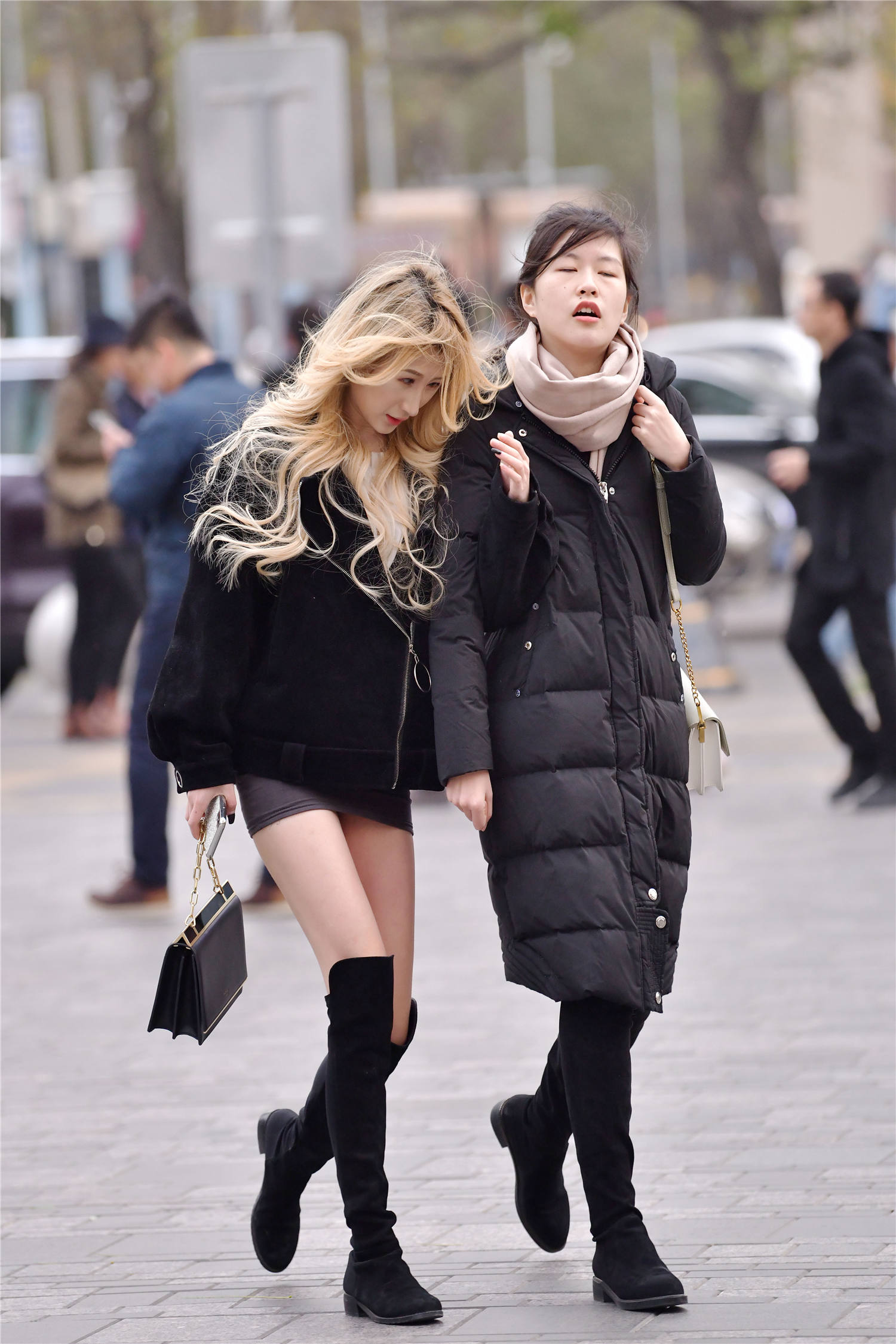 她身边的姑娘,穿着非常保暖,一款长款的羽绒服,过膝的长度,非常保暖,宽松的款式,这样的搭配很轻松,一双黑色长靴,平底的款式,这样她的搭配非常简单,也是简单的黑色冬天出门也可以这样搭配,虽然不是很显身材,但是很多人会这样穿搭,一款暖色的围巾,又让她的穿搭更加保暖,这也是最常见的搭配。