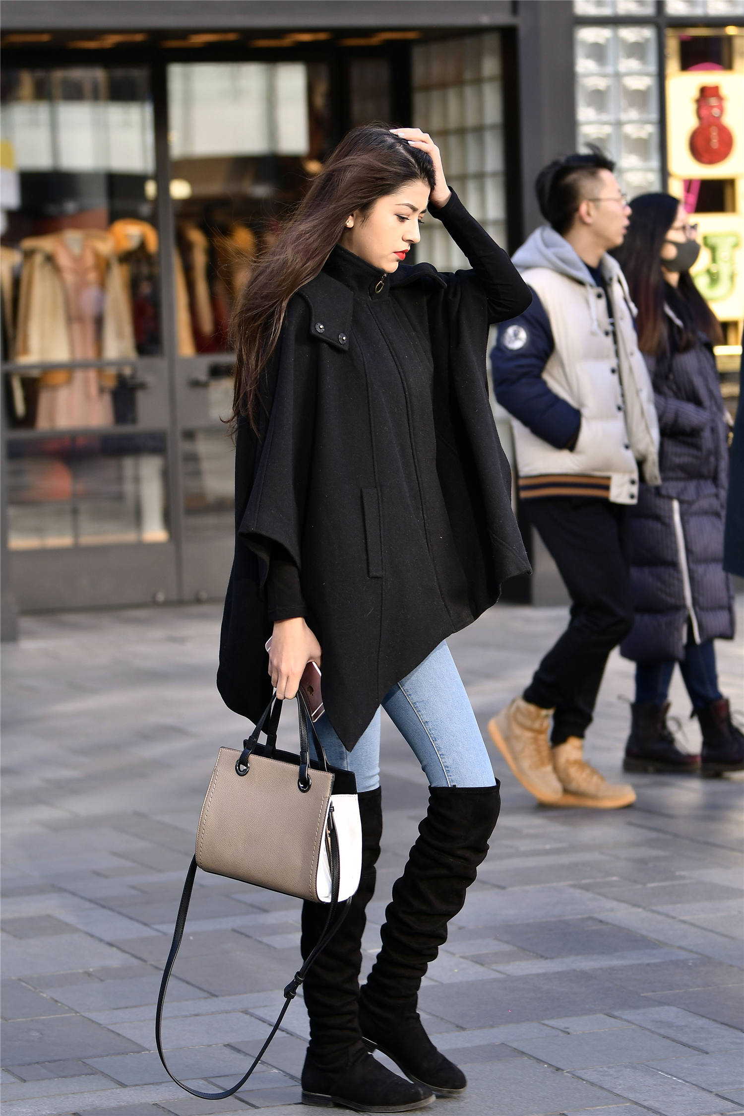 穿着平底的过膝长靴,会很舒适,也会有很多姑娘穿着出门,这位姑娘说穿着黑色过膝长靴,靴筒略带褶皱,这样会更有显瘦的效果,浅蓝色的紧身牛仔裤,非常细致的纹理,搭配出很精致的感觉,也显得非常好看,还显身材苗条,一款变得黑色外套,这样搭配很简单,却显得非常好看。