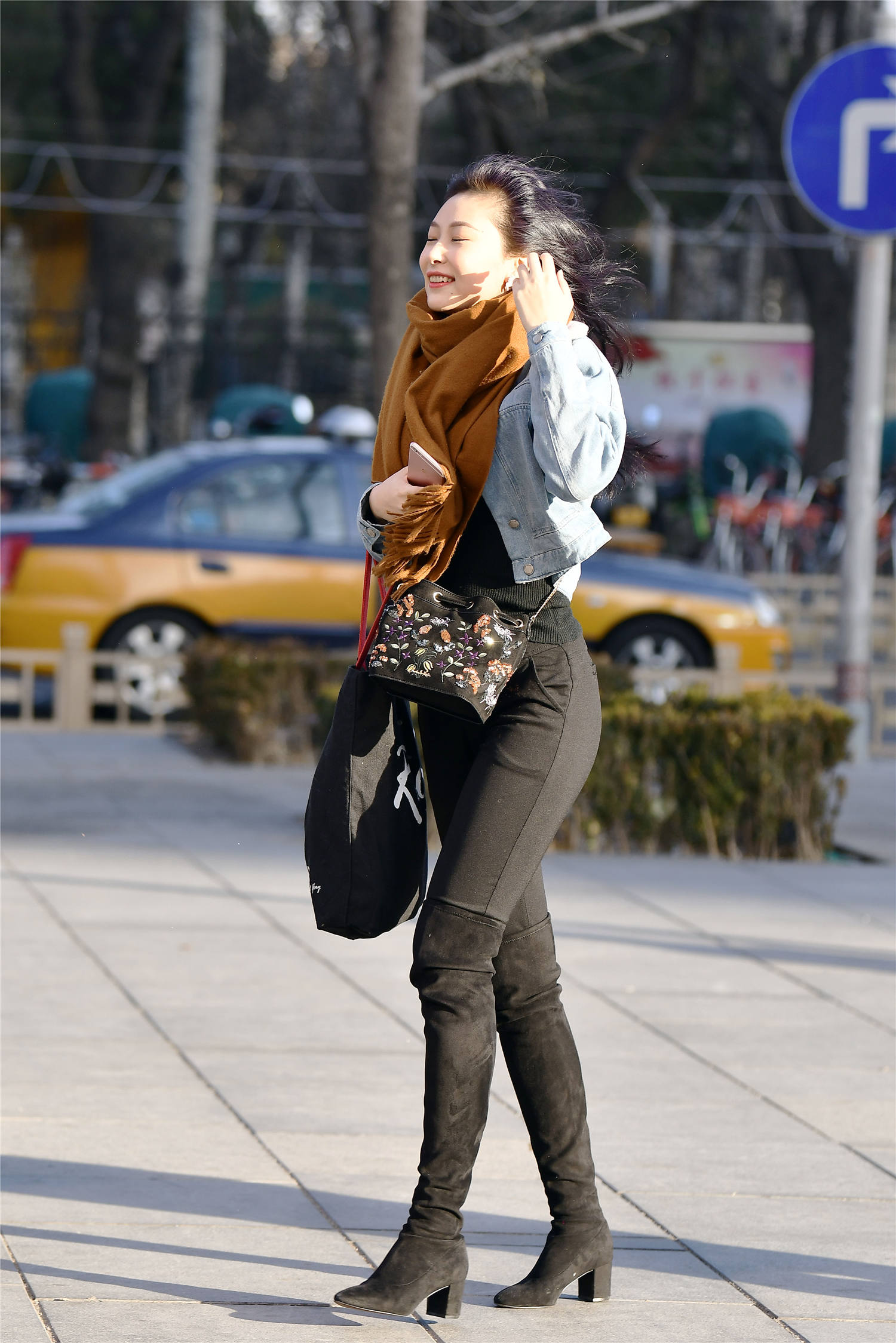 冬天有很多保暖的组合,长靴搭配紧身裤,是很好看的冬季搭配,也穿出自己身材曲线,这位美女选择一款黑色绒面长靴,5厘米的粗跟,非常好看,也显得非常秀气,搭配黑色紧身裤,微胖的身材这样搭配非常好看,也衬托出自己的时尚味道,为了展示身材比例,一款浅蓝色的短衣襟牛仔夹克,驼色的围巾,更有着保暖的效果。