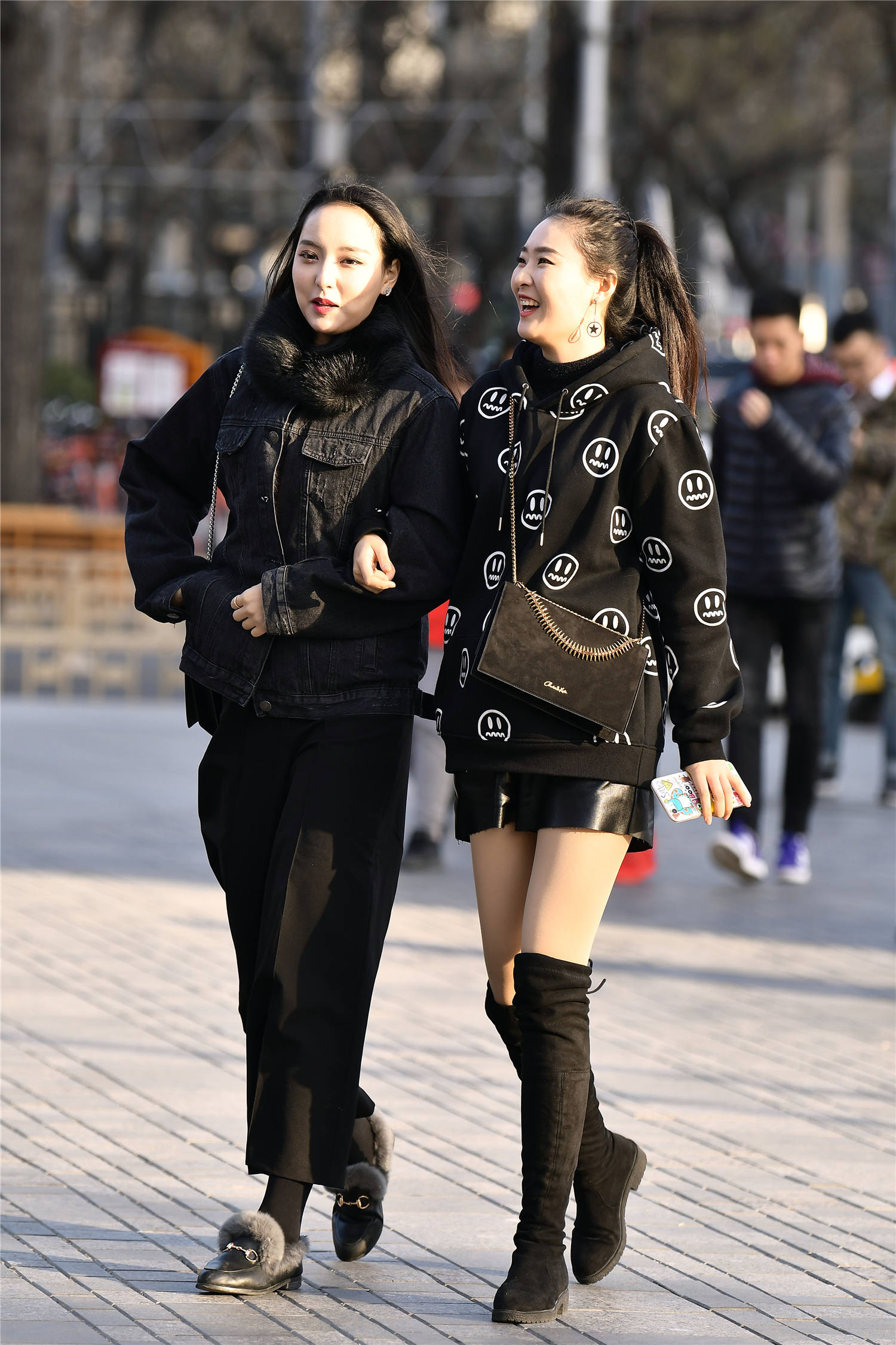你在冬天会搭配什么色彩,会穿出怎样的效果呢,层次感是非常重要的,所以选择服装搭配,就要看一下这些衣服的质感,这位美女选择黑色绒面过膝长靴,圆头的款式,非常简约,搭配肉色打底裤,看起来修身效果很好,也有着显瘦效果,黑色皮裙,会衬托出精致的感觉,黑色卫衣,外面是白色笑脸图案,非常有层次的搭配感觉。