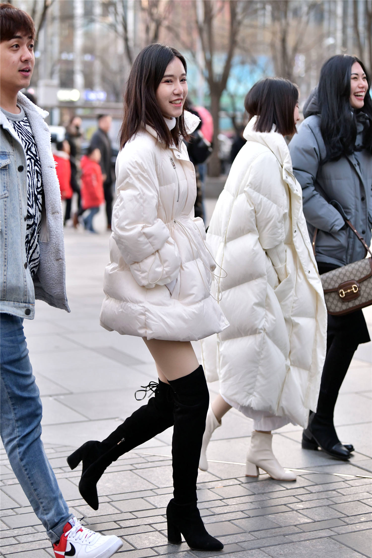 时尚的姑娘,知道自己该如何搭配自己,长靴无论是高跟鞋,还是平底的,都会选择过膝款式,保暖还时尚,也能穿出气质美,看一下这位美女,选择一款黑色的过膝长靴,8厘米的粗跟,尖头的设计,非常好看,也衬托出很经典的效果,肉色的打底裤,搭配出很修身的效果,也让靴子非常好看,一款宽松的白色羽绒服,短款的设计,非常好看。