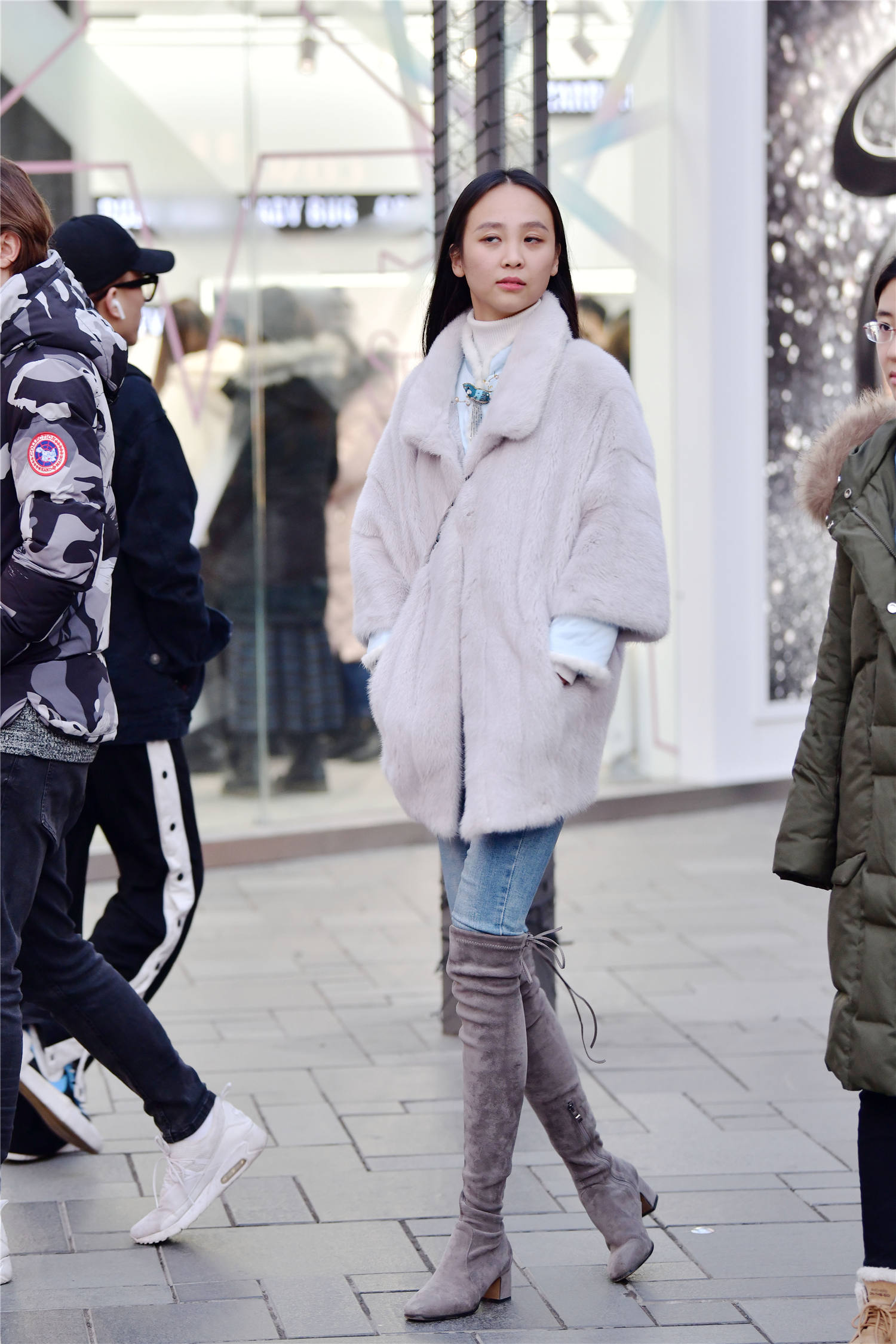 每一年的冬天,有很多喜欢出门逛街的姑娘,她们穿搭保暖,还要展现出时尚的味道,皮草的搭配,是很经典的,带着十足的质感,还衬托出气质美,看一下这位美女选择一款米白色的中短款皮草外套,非常好看的设计,里面搭配高领的白色针织小衫,蓝色紧身牛仔裤搭配一双深灰色的长靴,搭配出显瘦,还显高挑的效果。