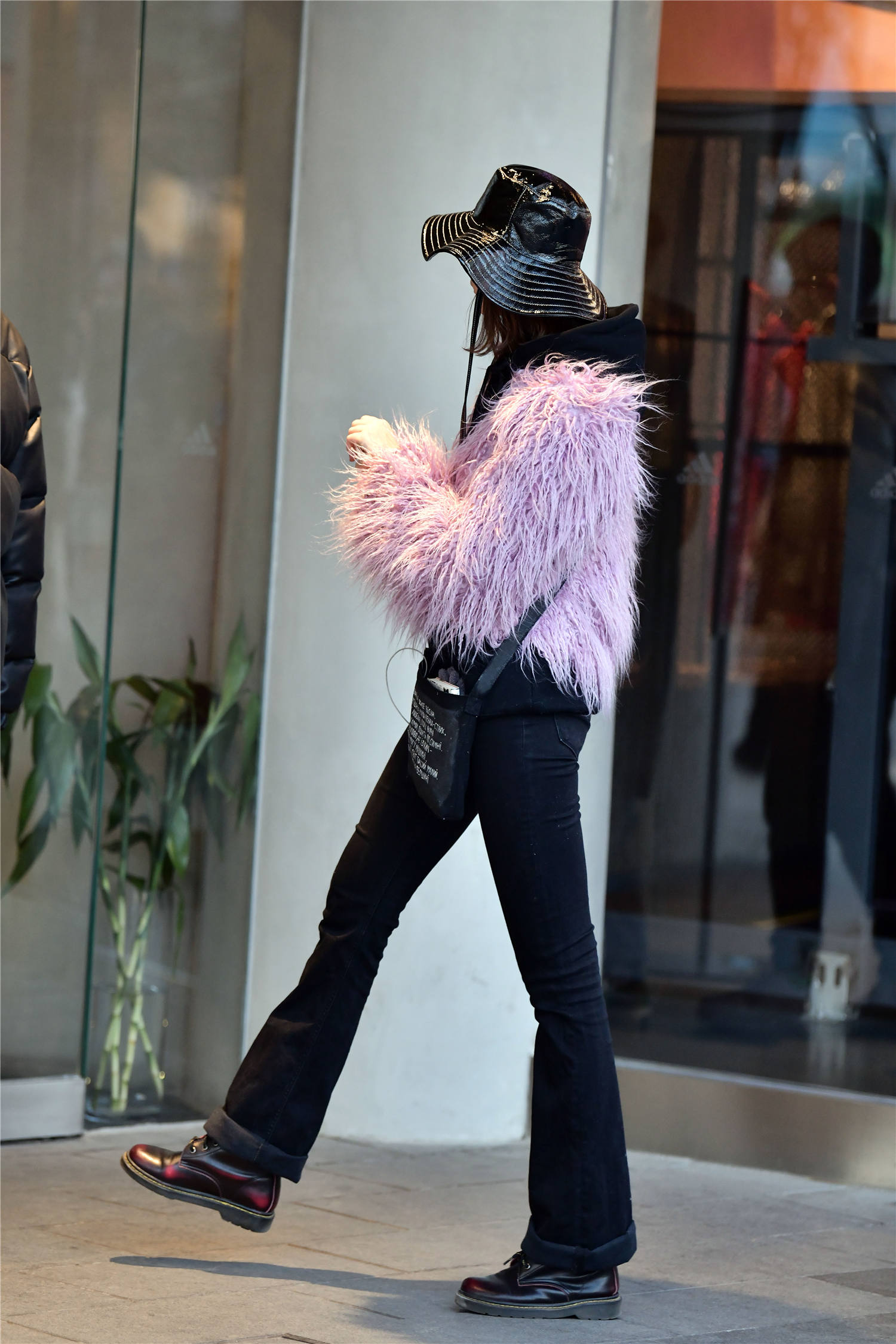 很多时尚姑娘,为了搭配出精致时尚,她们选择短款的皮草搭配,也是想穿出自己的时尚味道,这位美女选择一款紫色的仿皮草外套,短衣襟的设计,非常显身材,一款黑色小喇叭裤,非常简单的设计,穿着一双含红色的渐变马丁靴,有着小女生的感觉,黑色的漆皮帽子,非常有质感的款式,穿出自己的时尚感觉。