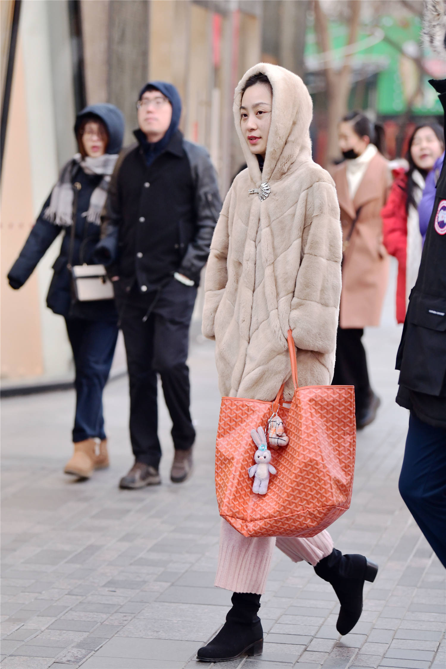 每个人喜欢的风格不一样,也会展现出不同的时尚味道,这位美女选择一款米黄色的皮草外套,缝合线设计,非常有层次感,姑娘把帽子戴起来,更有保暖的效果,浅粉色的展示长裤,宽松的设计,搭配出很休闲的感觉,脚下的黑色绒面短靴,也很简单,橙黄色的拎包,非常个性,也增加色彩。