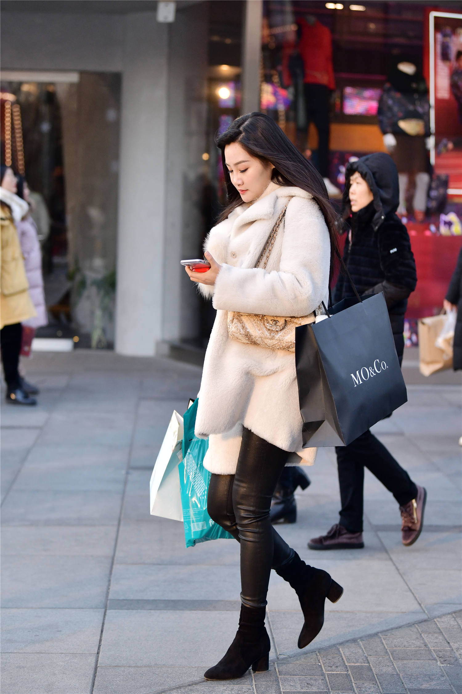 好看的皮草,会衬托出精致的感觉,也有着时尚的味道,这位美女选择而白色短款皮草,非常休闲的款式,也衬托人很精致,短绒毛非常好看,搭配黑色皮裤,非常修身的款式,这样搭配出深浅色的对比,也穿出好身材的效果,脚下一双黑色粗跟短靴,逛街会很轻松,还穿出女人味。