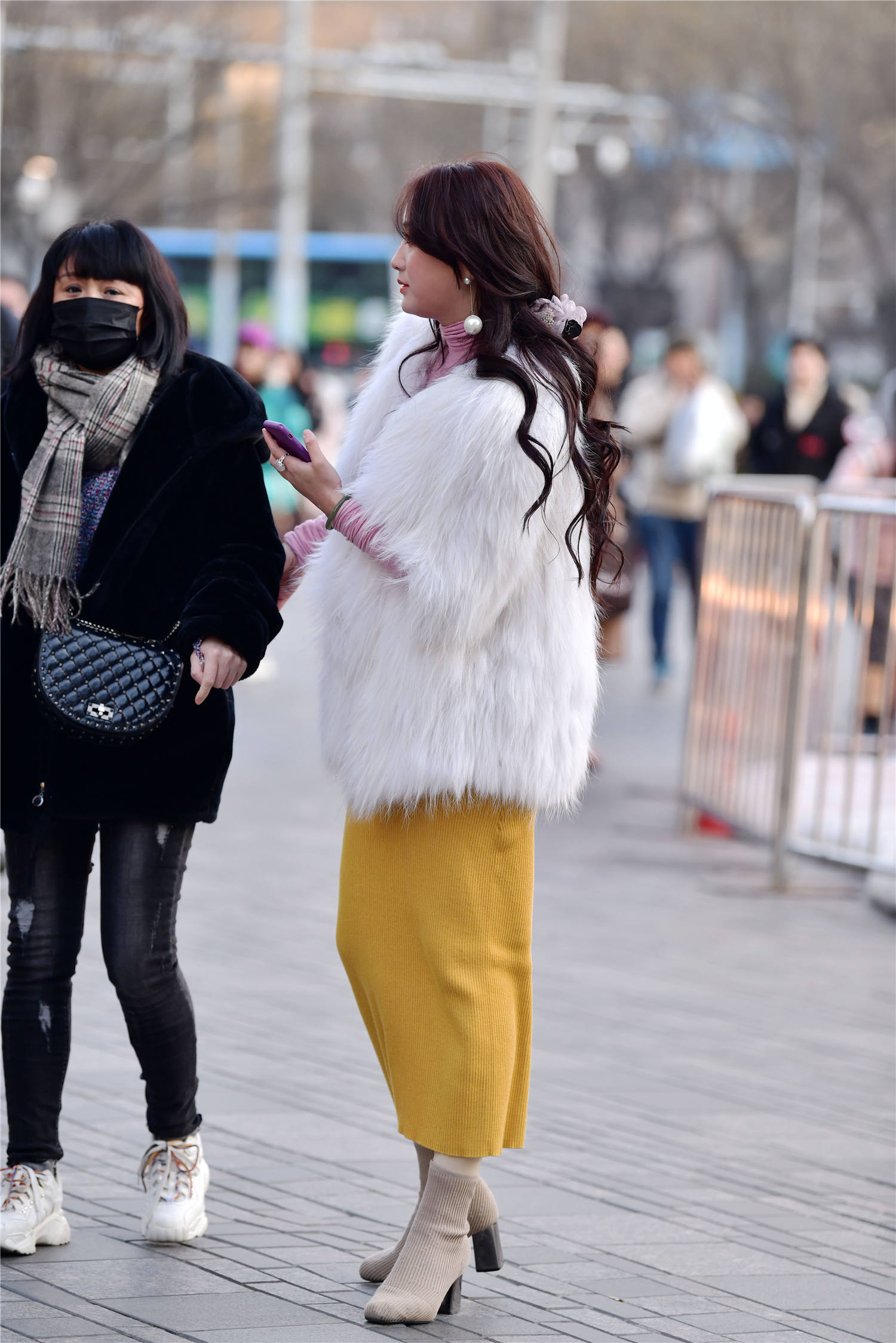 很多人的冬季色彩会有所不同,大多数人穿着深色服装,她们就是要搭配浅色,这样逛街也会彰显自己,这位美女选择一款白色皮草外套,半袖的设计,非常个性,也展现出很精致的感觉,一款黄色的半身长裙,搭配一双浅灰色的粗跟短靴,露出一点打底袜,这样穿搭有着冬季效果,还显出非常有层次和色彩的搭配味道。