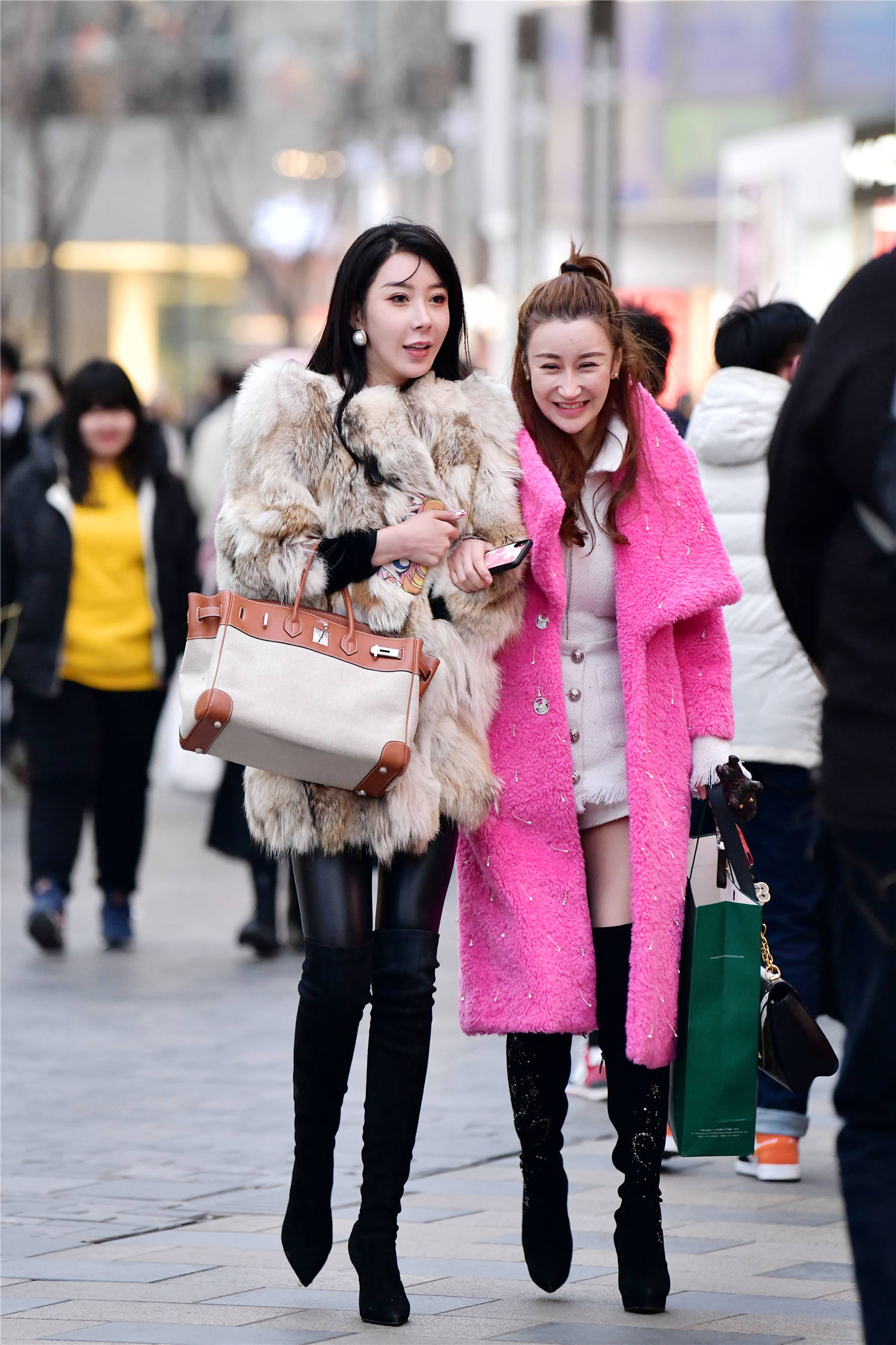 冬季要搭配出精致自然的效果才是最好的,所以很多姑娘会选择非常好看的服装,这一对闺蜜穿搭,很精彩,一位穿着中短款的浅色皮草,有着一点渐变色,才显得更加真实,也显得非常有气质,黑色皮裤,非常有质感,还很显身材,绒面尖头高跟长靴,更好地衬托她的身材,她的姐妹是高跟长靴搭配粉色厚实的风衣,非常有色彩的搭配。