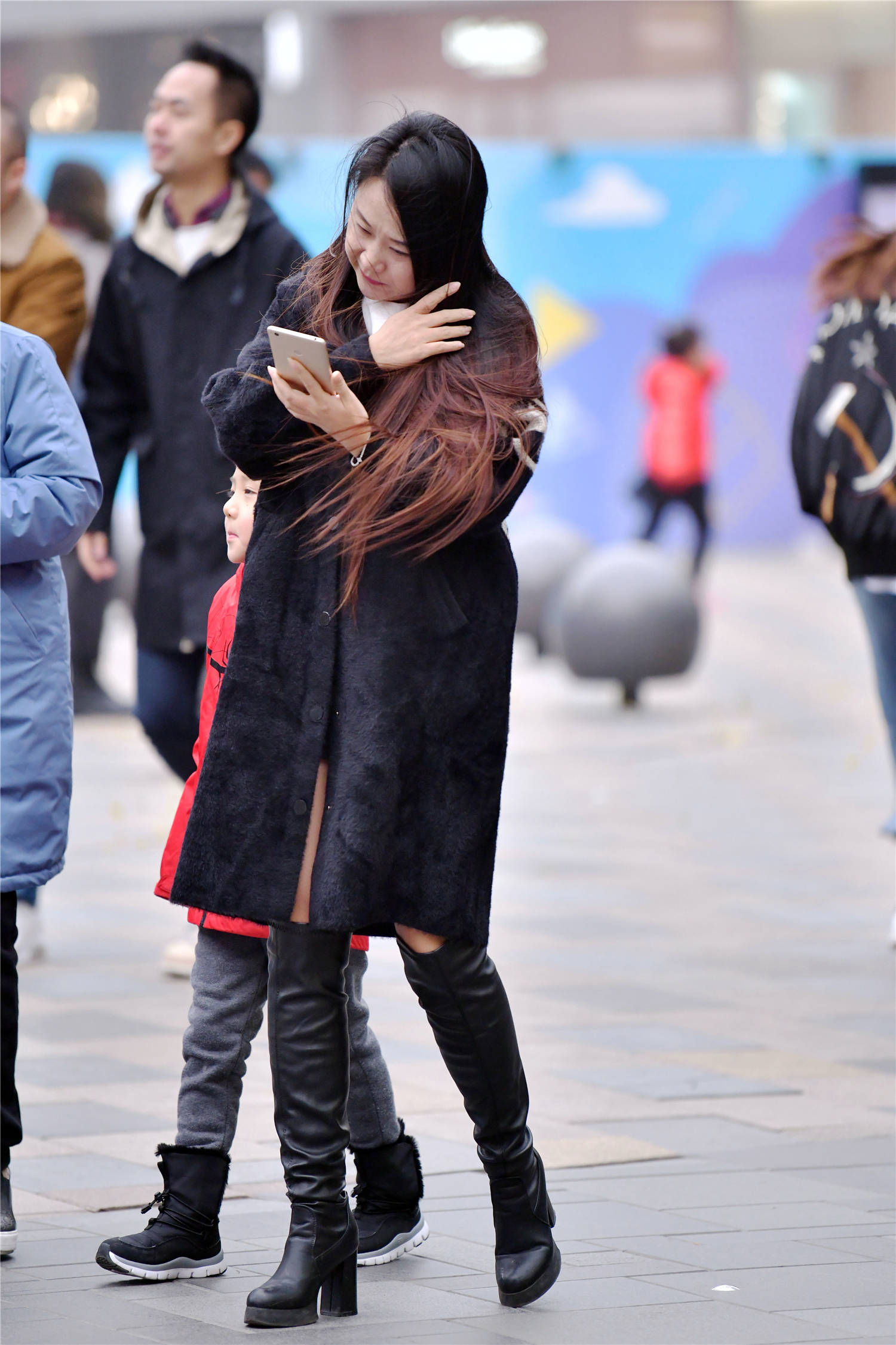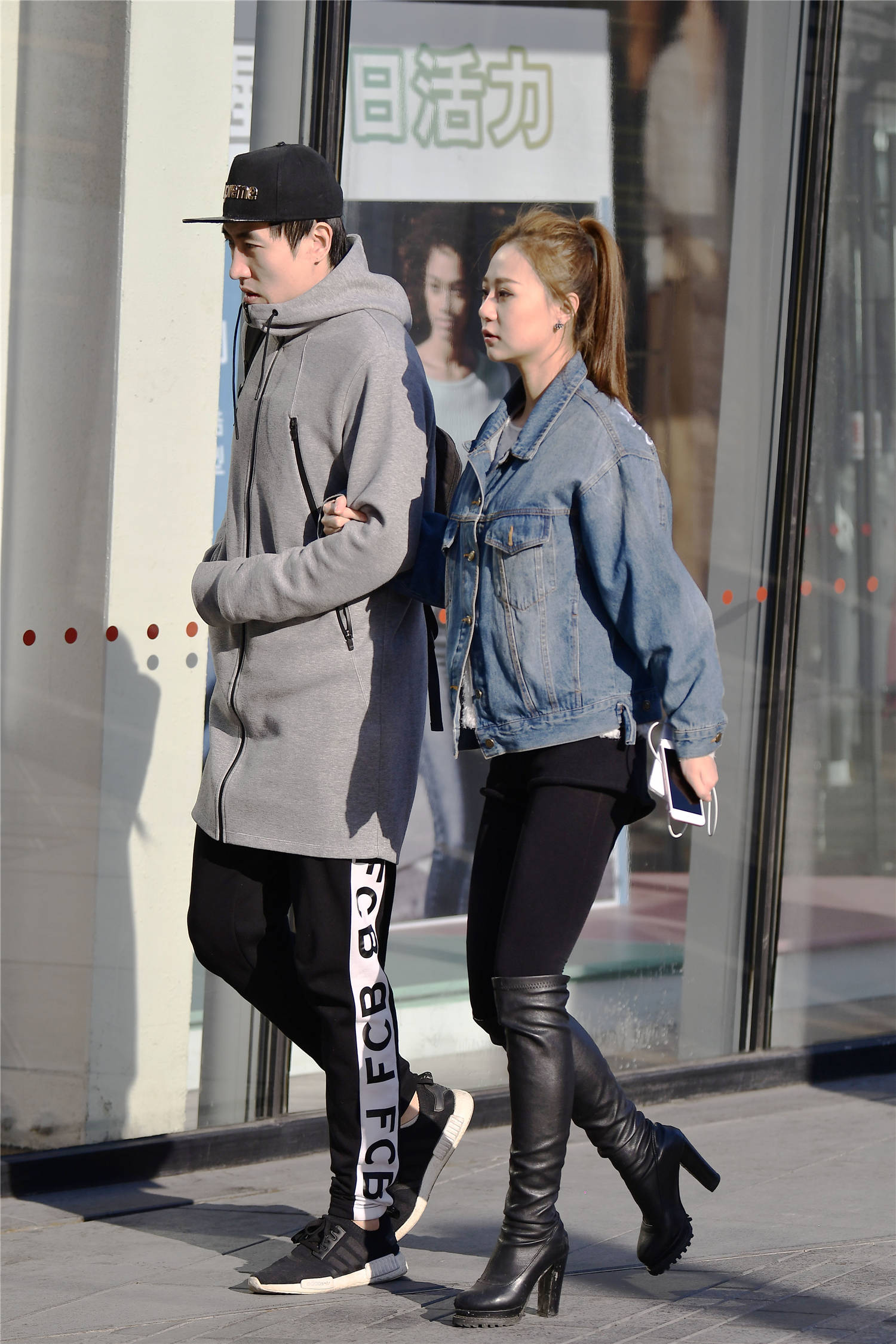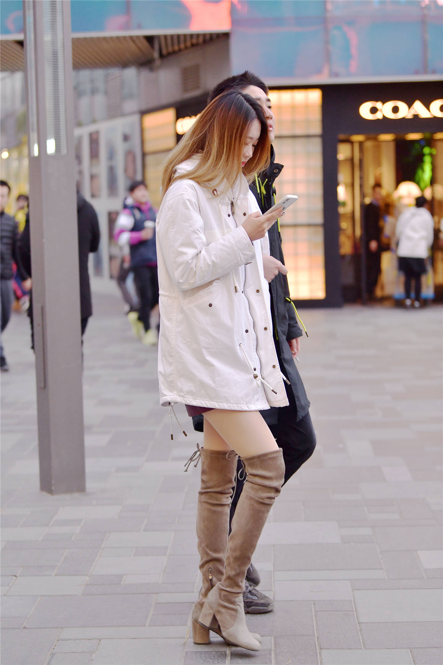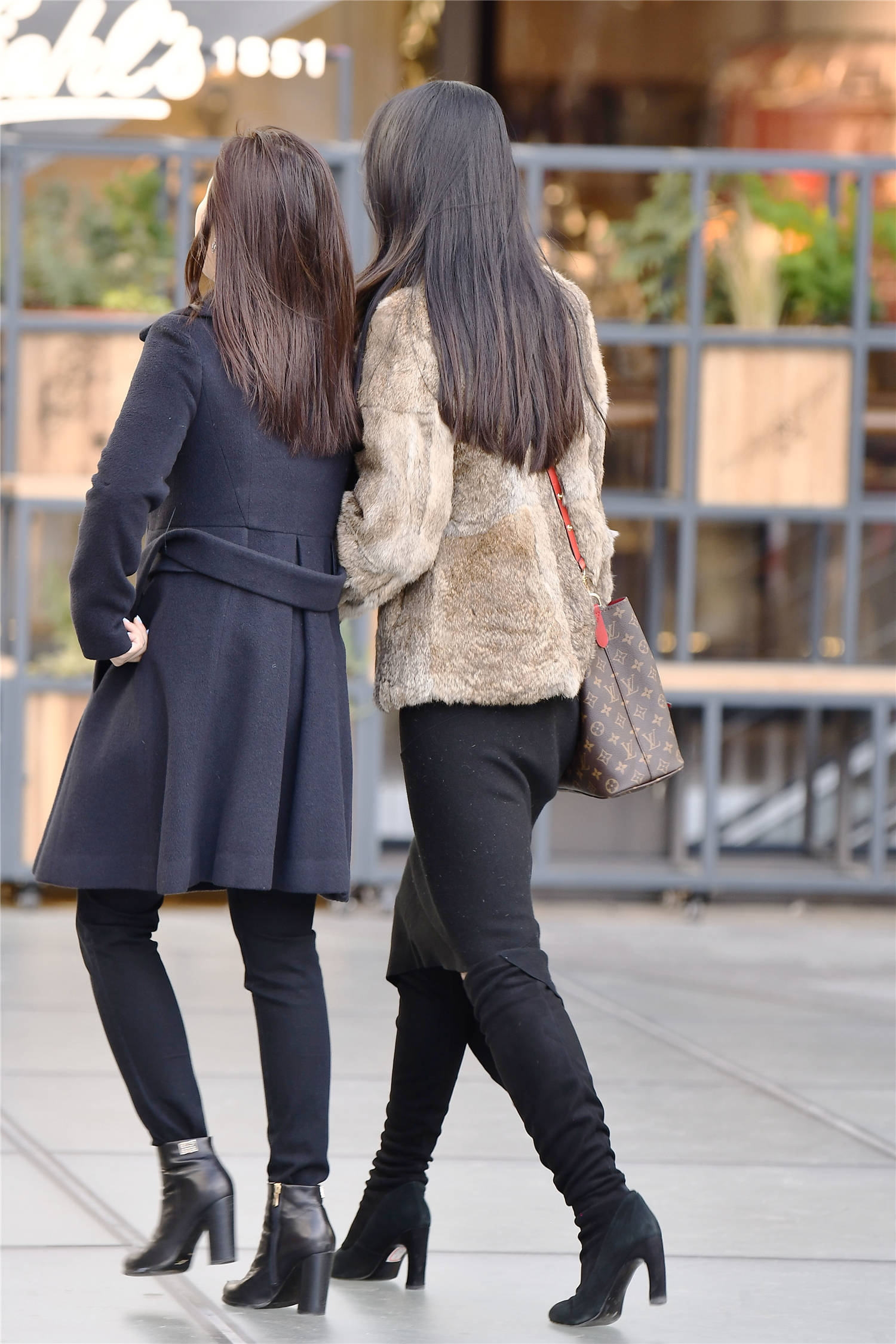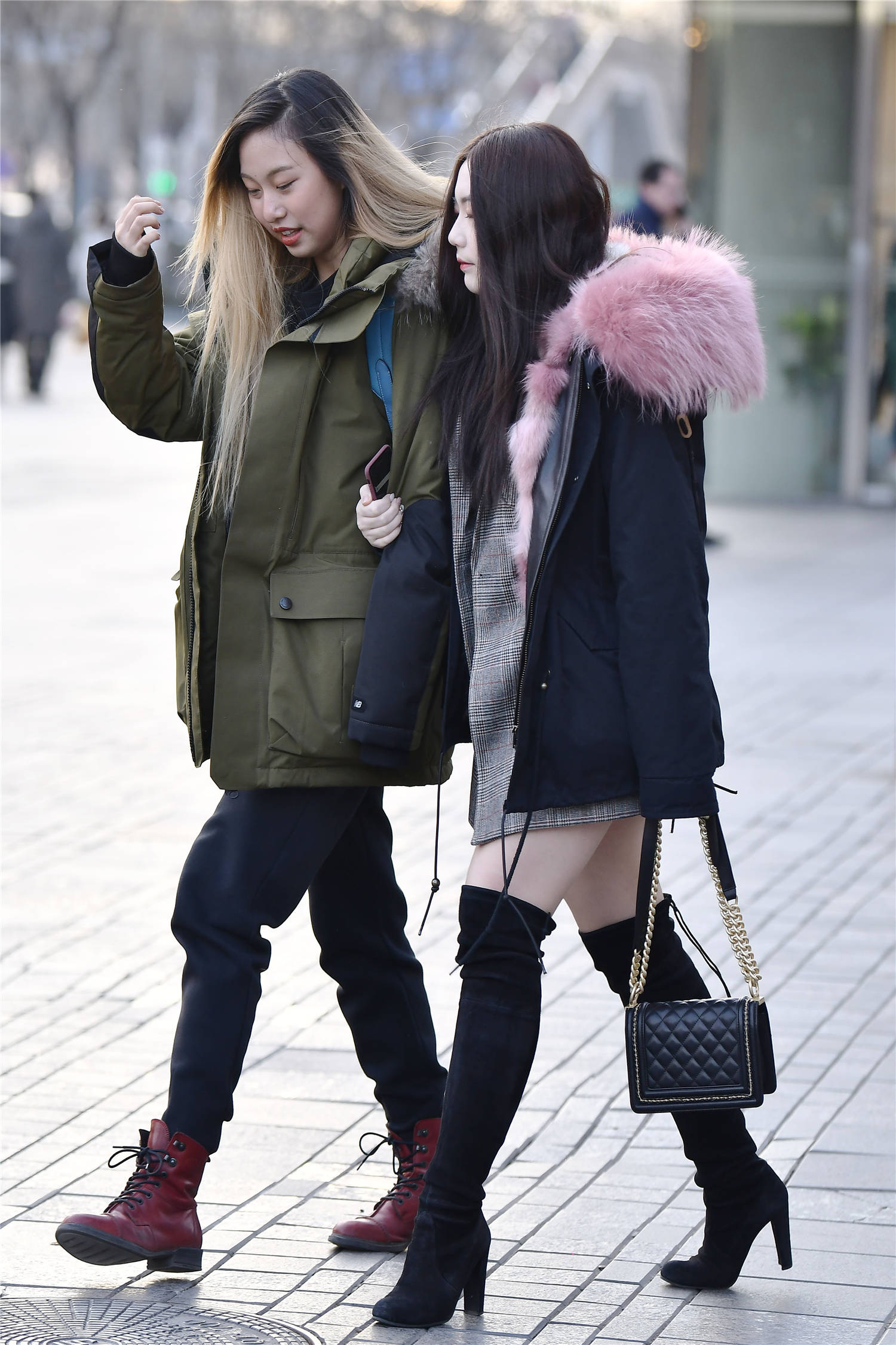 逛街约着闺蜜一起,你要穿出精致的味道才好,这位美女选择黑色过膝长靴,粗高跟的设计,衬托出身材的高挑,修身的款式,也搭配出很精致的感觉,灰色的呢子衣服,搭配黑色的棉服,这样穿出保暖的效果,她的姐妹穿着黑色长裤搭配一双棕色短靴,这样有着对比的搭配效果,穿出自己的时尚味道。