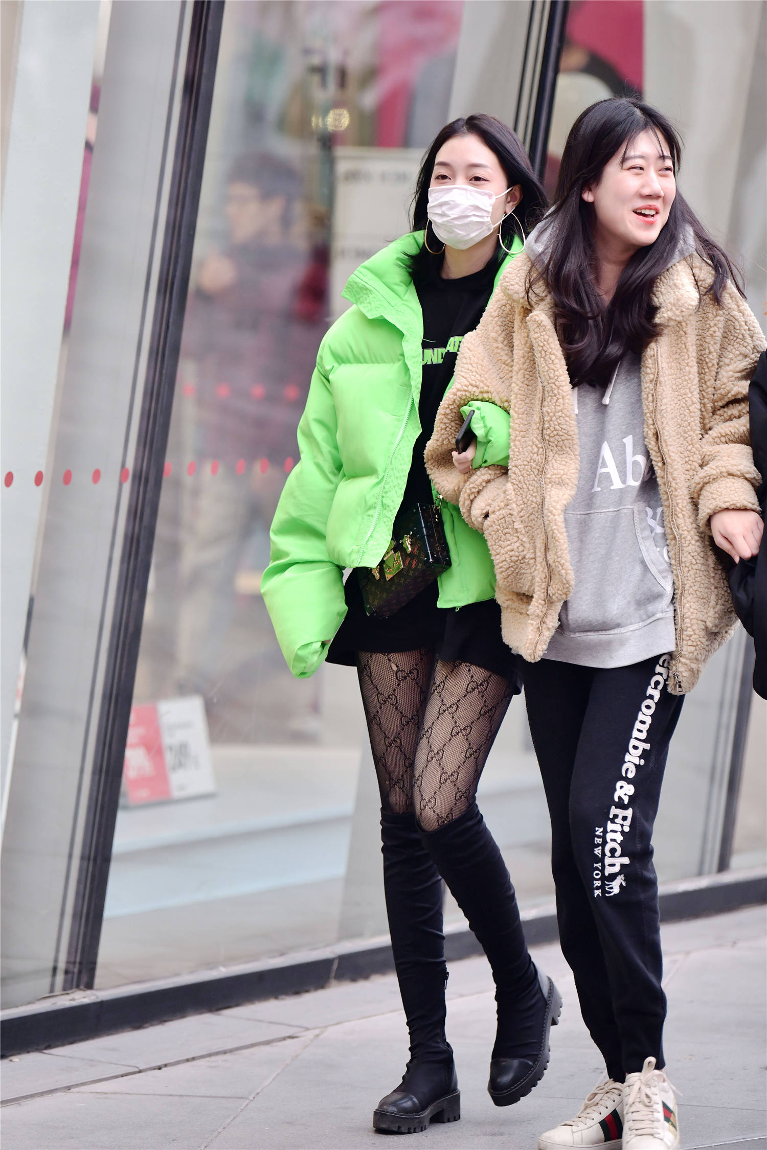 想要穿出自己的时尚感觉,就要敢于搭配自己的服装,也要敢于尝试各种色彩的搭配,这位姑娘选择黑色厚底的过膝长靴,有着显瘦的效果,也搭配出很精致的感觉,这位姑娘选择一款网袜,非常修身的款式,穿出很美的时尚感觉,一款黑色衬衣,外面一款荧光绿的短款羽绒服,穿搭出很有色彩的效果。