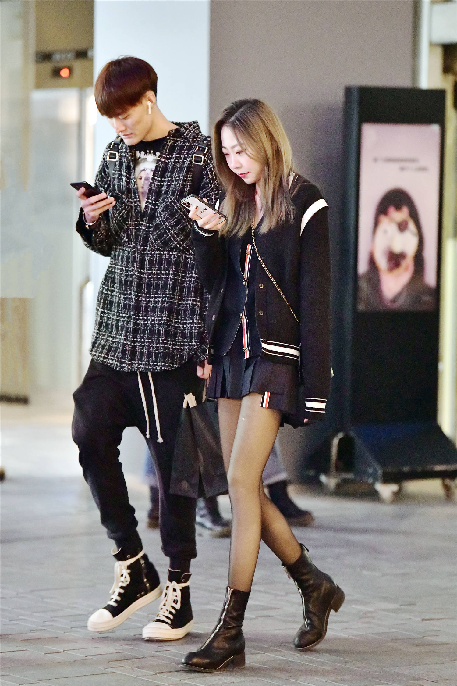 也会有身材骨感的姑娘,穿着显瘦的效果,也会展现出精致的感觉,这位姑娘选择一款坡跟的短靴,黑色皮质,非常简单,穿出自己时尚味道,黑色丝袜也是比较厚实,也搭配出层次的效果,黑色皮质短裙,搭配一款卡其色的短款外套,非常简单,长发飘飘,这样就搭配出身材苗条的效果。