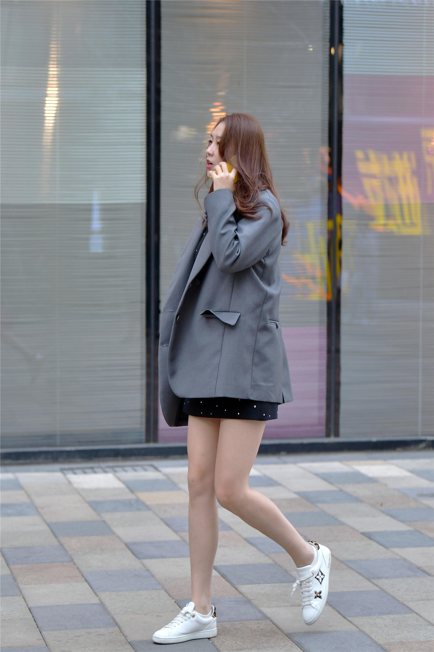 很多时尚姑娘有着自己的搭配想法,要想搭配出自己的味道,选择服装搭配会很关键,看一下这位姑娘的搭配,一款灰色的西服,里面一款黑色连衣裙,有着白色斑点增加层次和色彩,这样搭配也有着个性的风格,一双白色平底鞋,非常简约的搭配,露出匀称修长的双腿,这样搭配出混搭的风格,也展现出年轻的时尚味道。