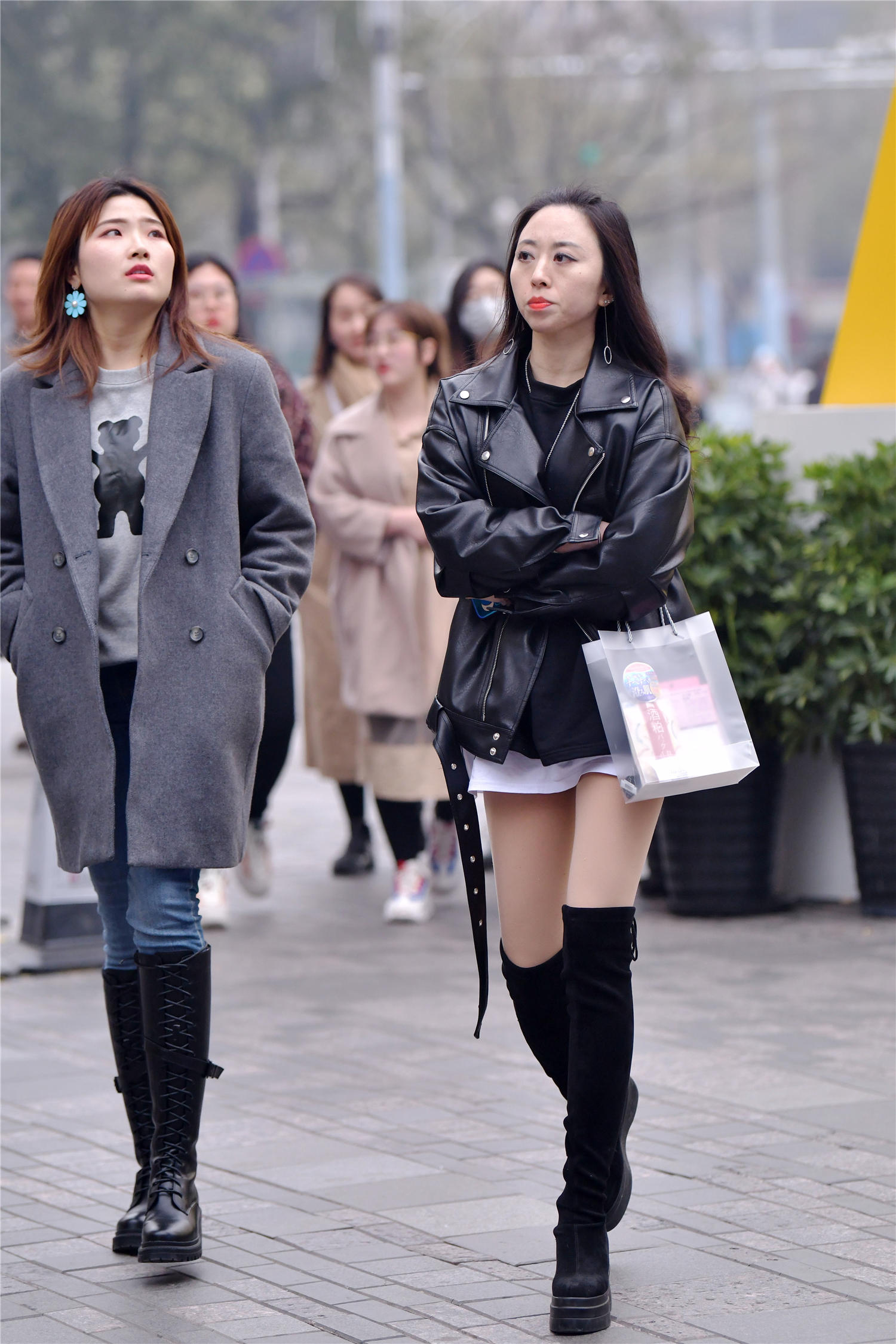 到了初春时节,其实还没有到春暖花开的时候,气温还是有点冷的,穿出自己的味道才是最好的,这位美女选择一款黑色过膝长靴,一款厚实的肉色丝袜,这样会显瘦保暖,还衬托出很精致的感觉,白色裙子,露出一点裙摆,黑色的皮夹克,很有质感的一款衣服,短款的衣襟,就搭配出时尚的感觉,搭配出自己的风格。