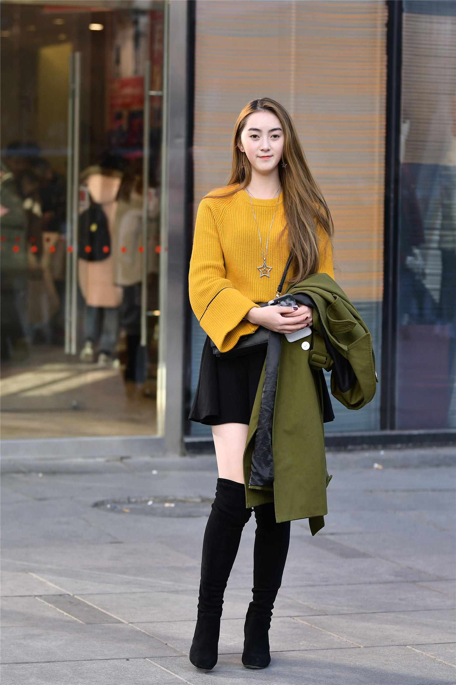 一年之计在于春,到了春天,要搭配出一点春天的味道,时尚的姑娘也有着自己的搭配想法,展现出自己的时尚味道,这位美女选择过膝长靴,黑色绒面款式,有着非常好的保暖效果,搭配一款黑色短裙,露出一点大腿,穿出不怕冷的时尚感觉,黄色针织衫,一款墨绿色的大衣搭在臂弯里,到了春天,就要搭配出一些春天的感觉。