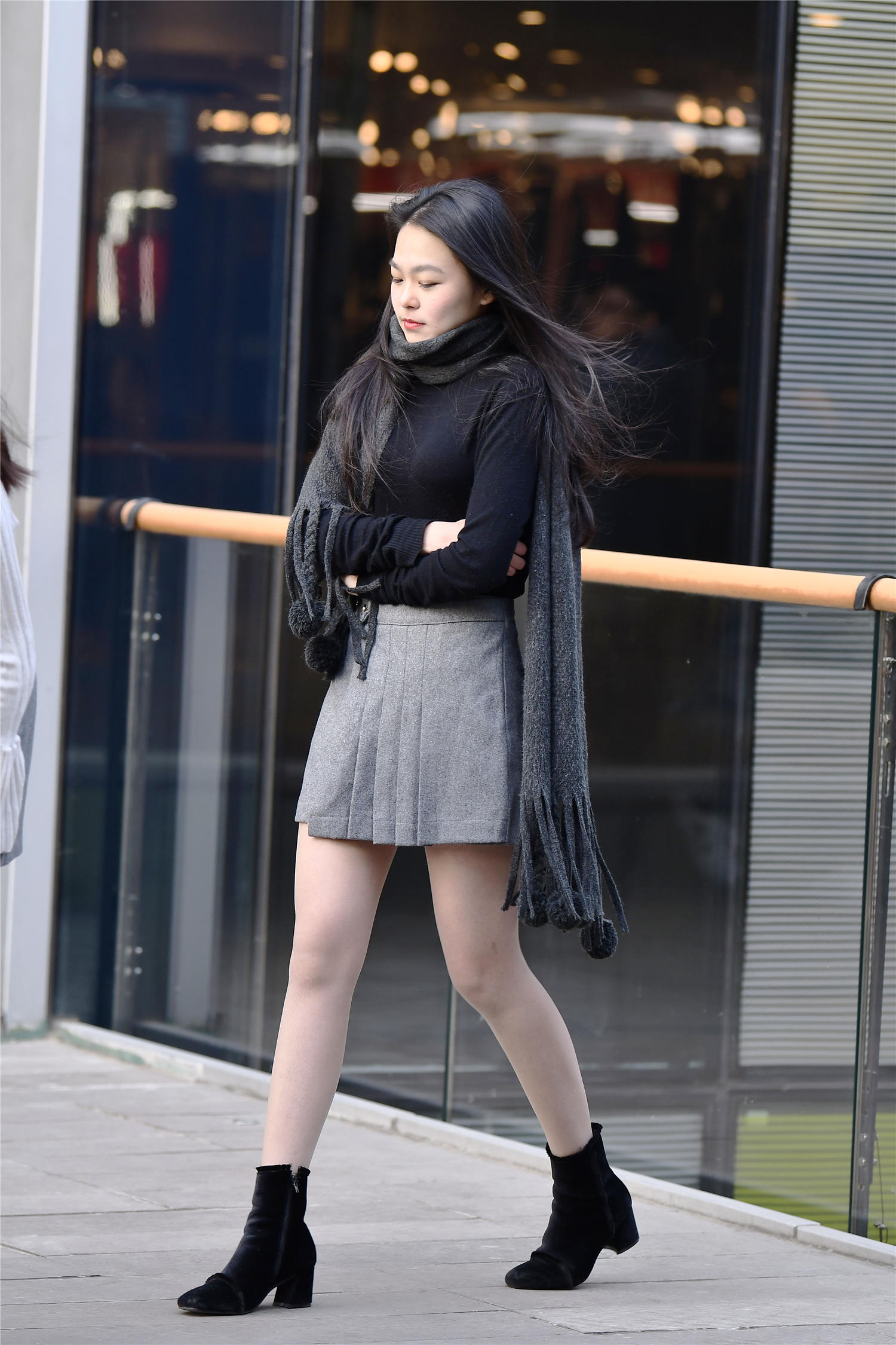 优雅的姑娘,总是会搭配出自己的味道,也会展示出自己的时尚感觉,这位美女选择黑色短靴,粗跟的款式,肉色的薄丝袜,也会穿出很精致的感觉,灰色的高腰筒裙,穿出自己时尚味道,才是最好的,黑色高领衫和一款深灰色的围巾,这样搭配很好看,还穿出自己的时尚感觉,有着自己的搭配想法。