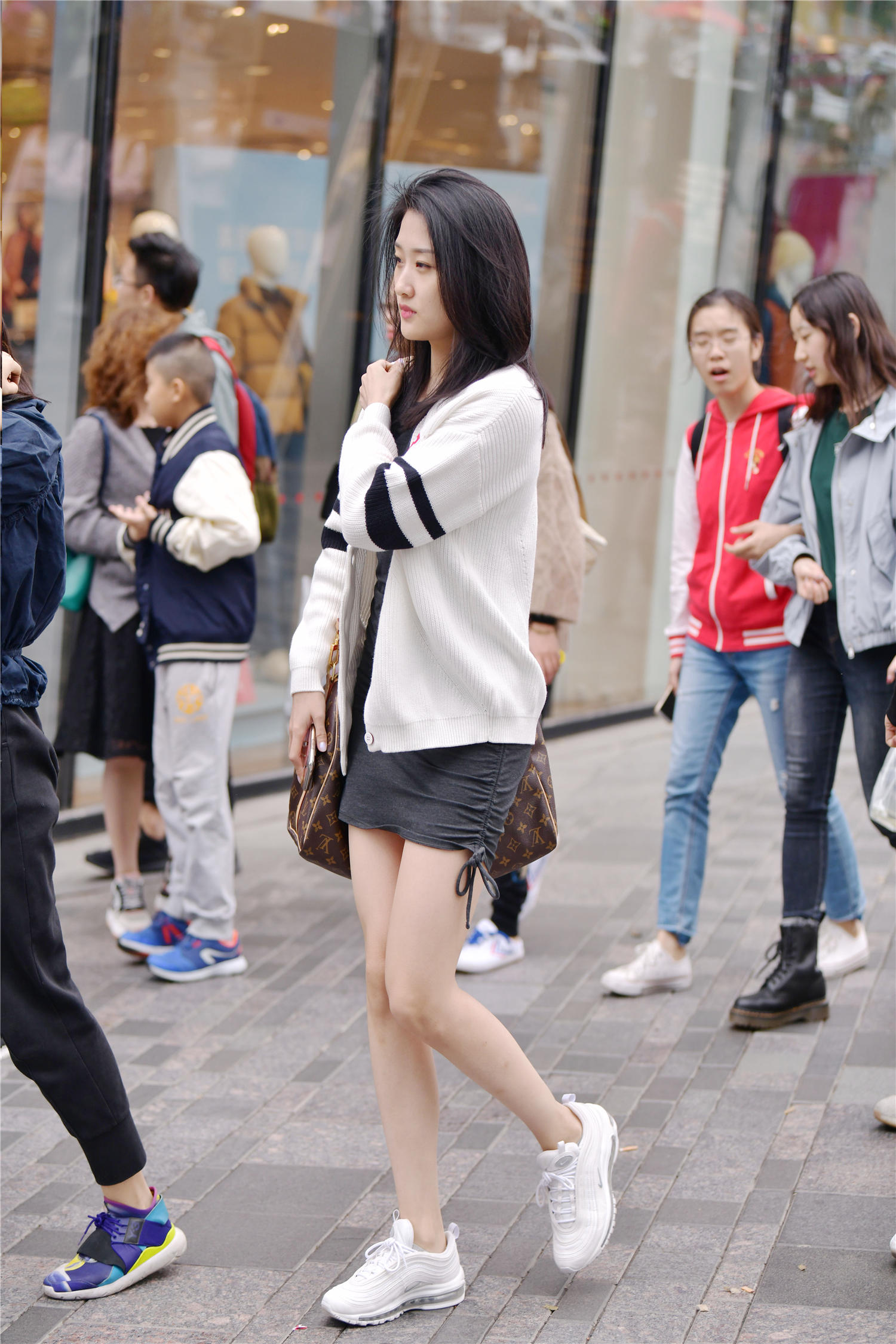 你出门的搭配,会不会和别人不一样,怎么穿出自己而时尚味道才是最好的,也搭配出清秀的感觉,看一下这位人群中的姑娘,白色的针织外套,袖子上的黑色,增加层次感,里面是深灰色的紧身裙,侧面的抽绳设计,非常好看,衬托出精致的感觉,脚下一双白色的厚底运动鞋,露出自己的白皙的大长腿,展现出很时尚的感觉。