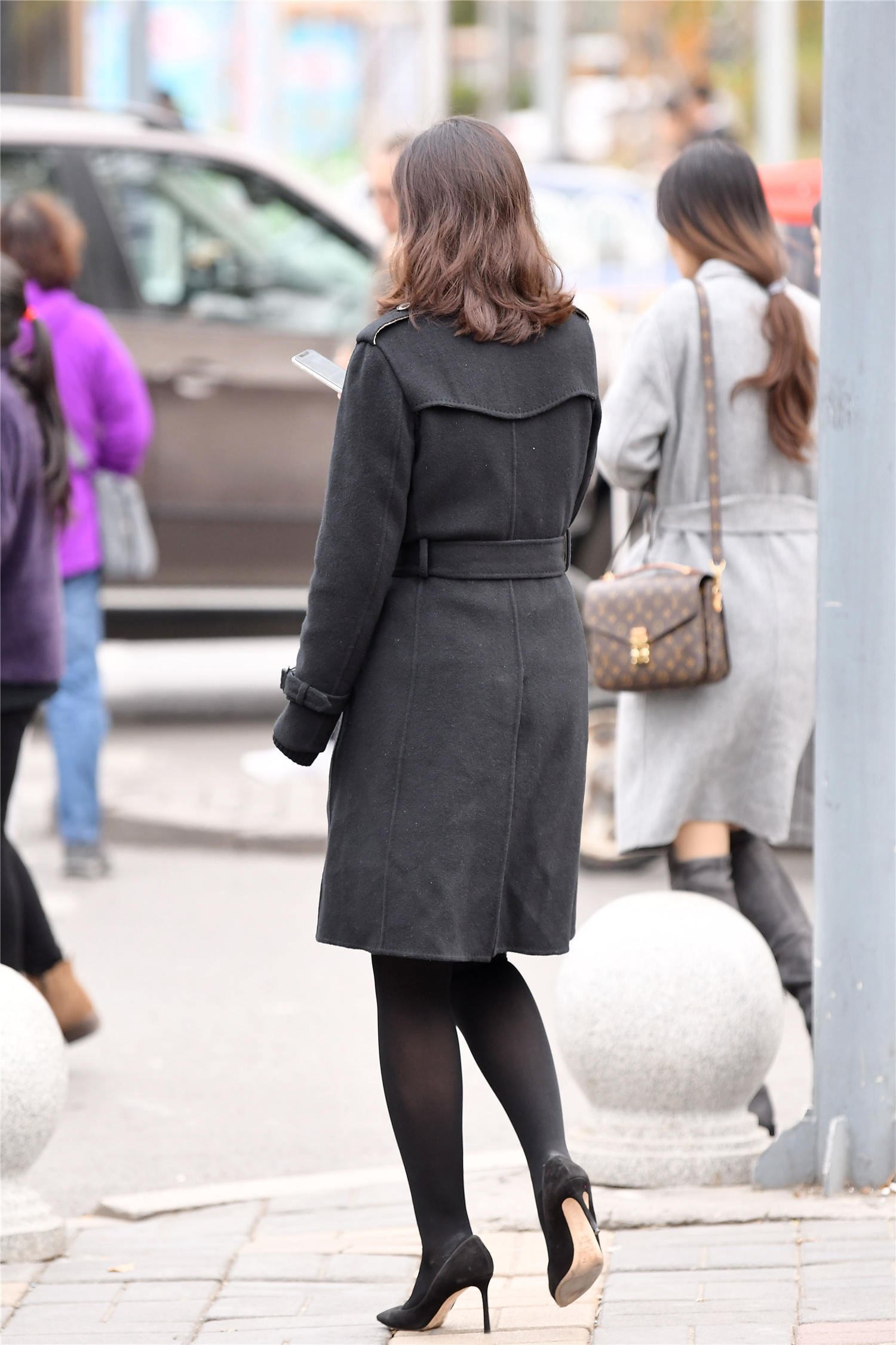 你冬天的色彩会怎么选择,只要自己喜欢就好了,这位美女选择黑色的搭配,黑色的风衣,收腰设计很紧,穿出显身材的效果,搭配出身材比例效果,黑色打底裤,非常厚实,也有着显瘦的效果,脚下一双黑色尖头细高跟单鞋,5厘米的细跟,非常好看,衬托出很精致的感觉,也搭配出很女人的感觉。