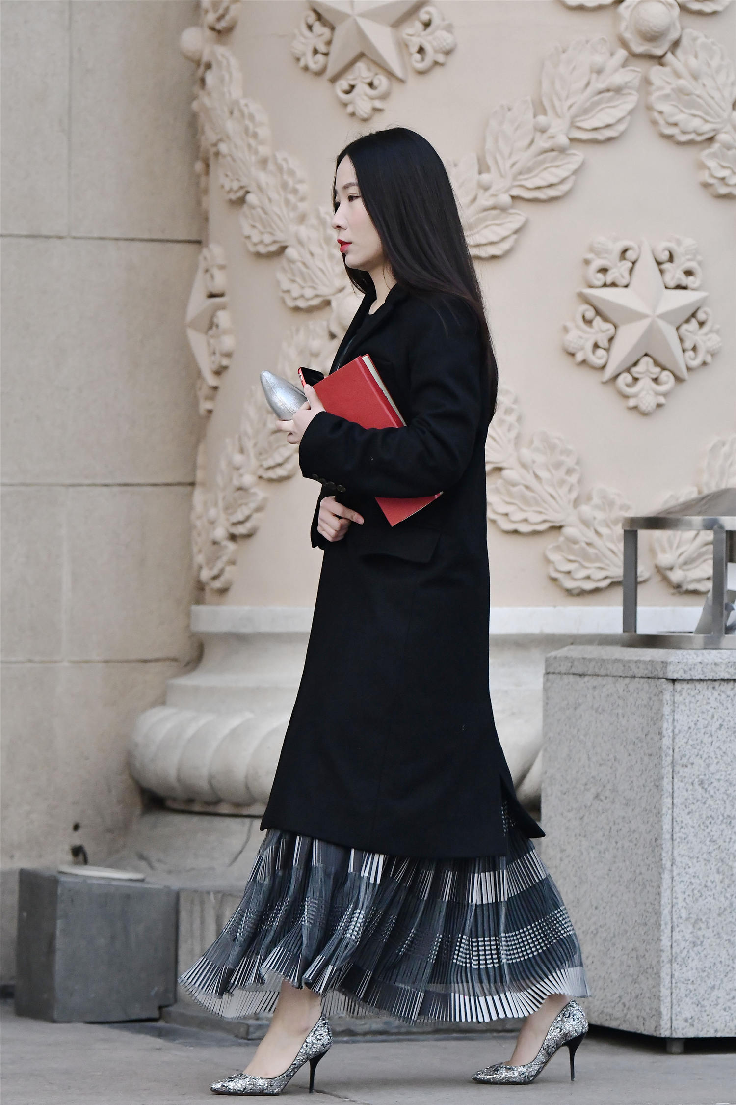 时尚的姑娘,知道自己如何搭配才会展现出气质,选择一双好看的鞋子,也是非常重要的,这位姑娘选择一款银色的亮片尖头细高跟单鞋,灰色的条格连衣长裙,有点薄纱,外面一款黑色大衣,搭配出显瘦的感觉,穿出自己的时尚味道,一头长发,搭配出很精致的感觉,也衬托出很精致的感觉。