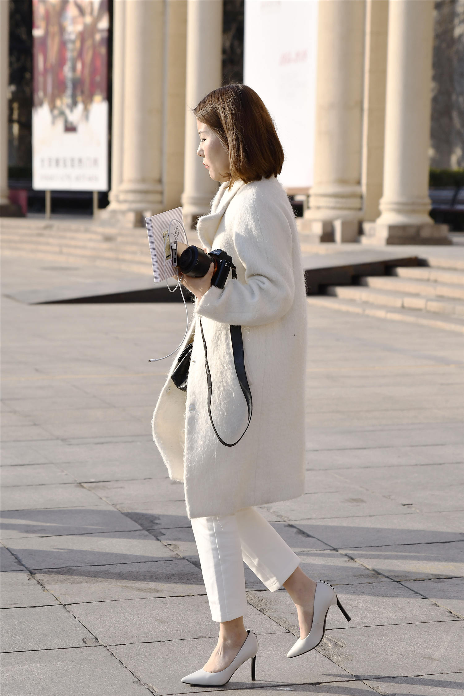 好多时尚姑娘,冬季出门也会搭配出自己的时尚味道,知道该如何穿出自己的感觉,这位美女选择一款米白色的尖头细跟单鞋,鞋跟不是很高,尖头细跟款式,非常漂亮,穿出自己的感觉,米白色的九分裤,露出脚踝的位置,搭配出不怕冷的感觉,米白色的中长款呢子大衣,冬季搭配显得非常干净利落。