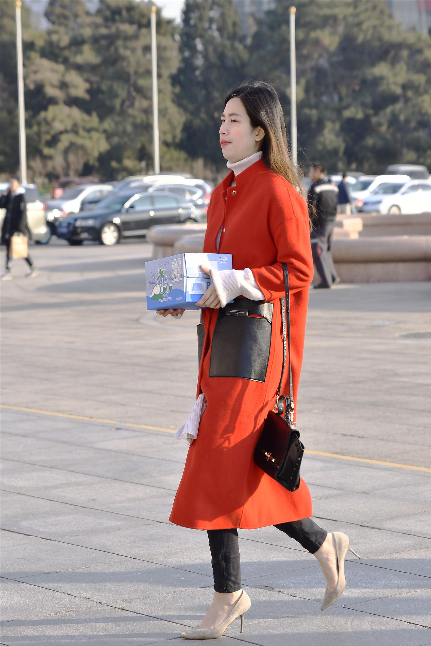 冬天有很多时尚姑娘出来逛街,也会搭配出自己的时尚味道,这位美女选择一款红色的呢子大衣,过膝的长度,里面一款浅粉色的高领毛衣,穿出很美的感觉,黑色的牛仔修身裤子,搭配出自己的味道,脚下浅灰色的尖头细跟鞋,银色的金属细跟,非常好看,5厘米的高度,磨砂皮的设计,金属鞋尖,增加装饰效果。
