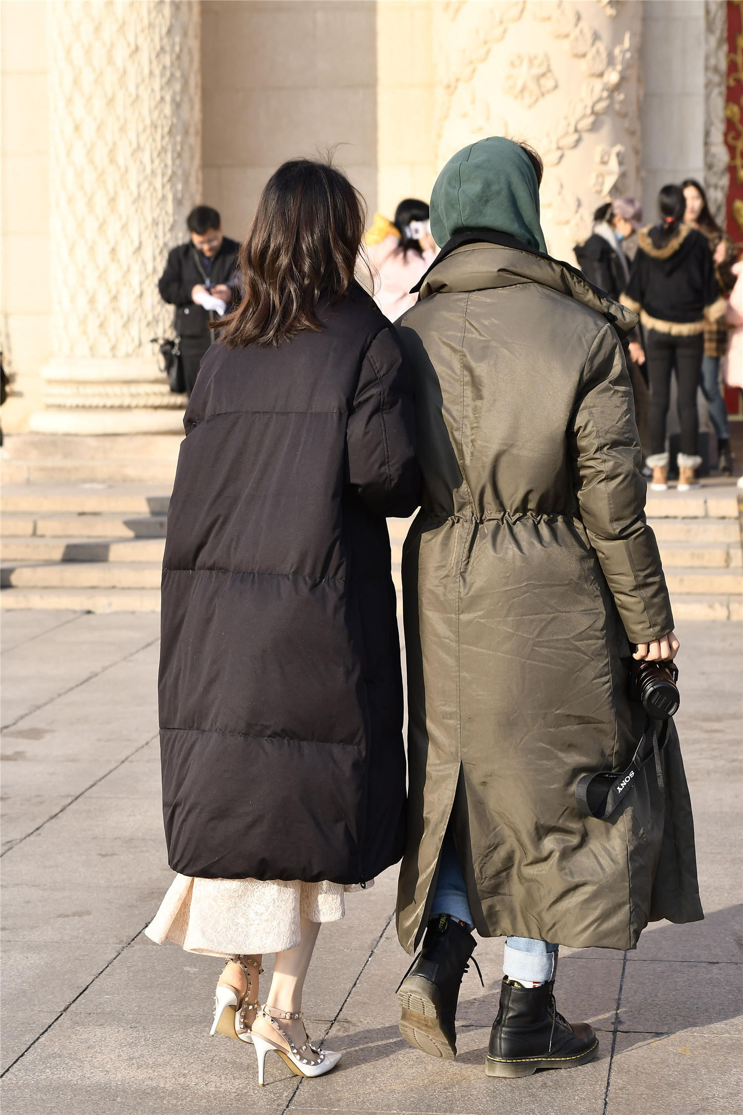 在冬天,你也会遇到那些不怕冷的姑娘,看着她们的穿搭,似乎是不会在外面,只是偶尔出来一下而已,看一下这位姑娘,一款黑色长款的羽绒服,里面是蕾丝的长裙,非常好看,裙摆上的纹理,非常好看,衬托出很精致的感觉,脚下穿着尖头细跟铆钉凉鞋,非常简单的款式,也是很经典的鞋子,冬天穿着,还真觉得她不怕冷。