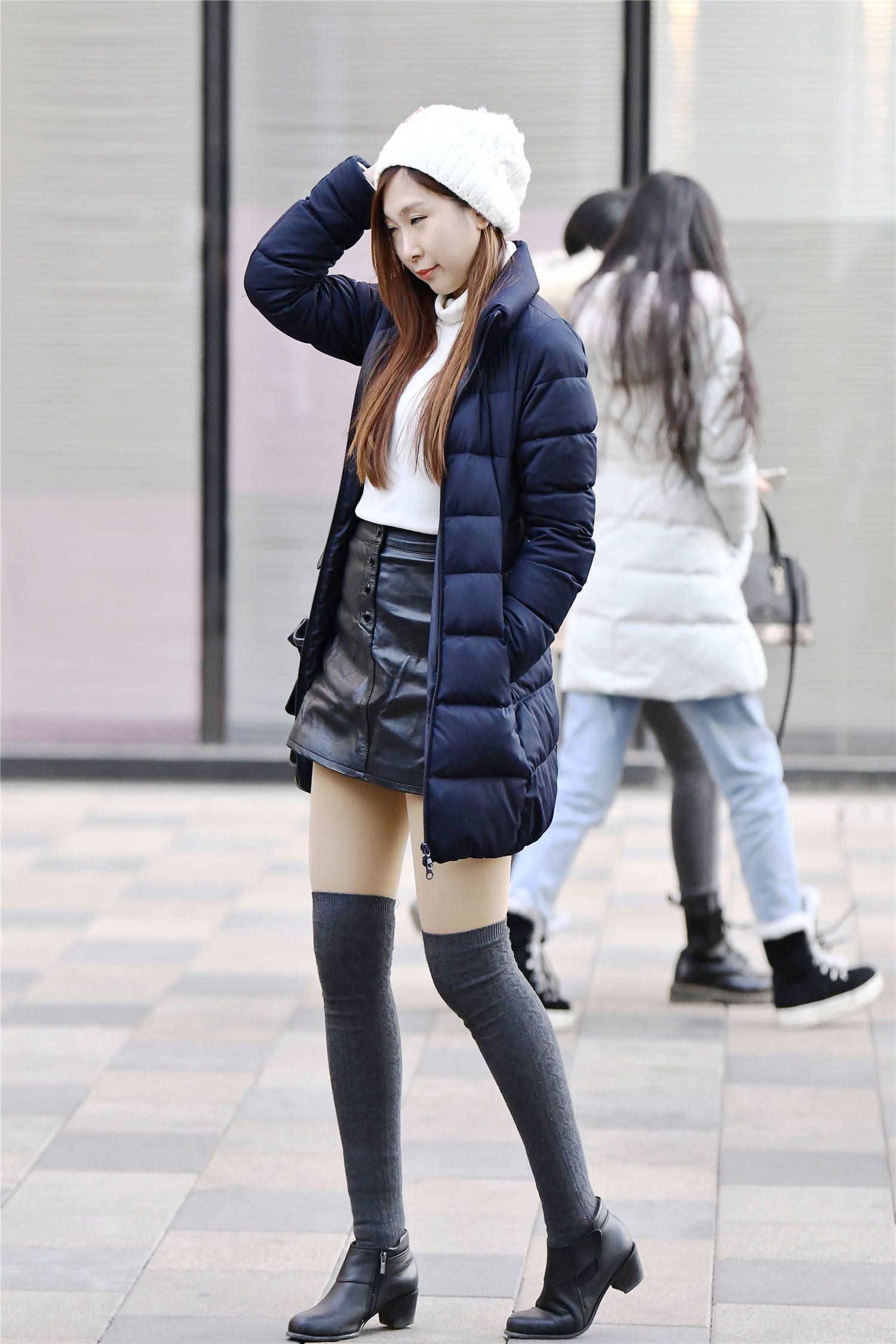 很多时尚姑娘,有着自己的想法,她们选择的服装们也会穿出自己的时尚味道,看一下这位小姐姐的穿搭,一双黑色粗跟踝靴,肉色打底袜搭配一款深灰色的长筒袜,这样搭配出显瘦的效果,还显得非常个性,黑色皮裙,显得身材比例很好看,白色高领小衫,外面一款深蓝色的羽绒服,穿出自己的感觉,春天这样搭配也很好看。