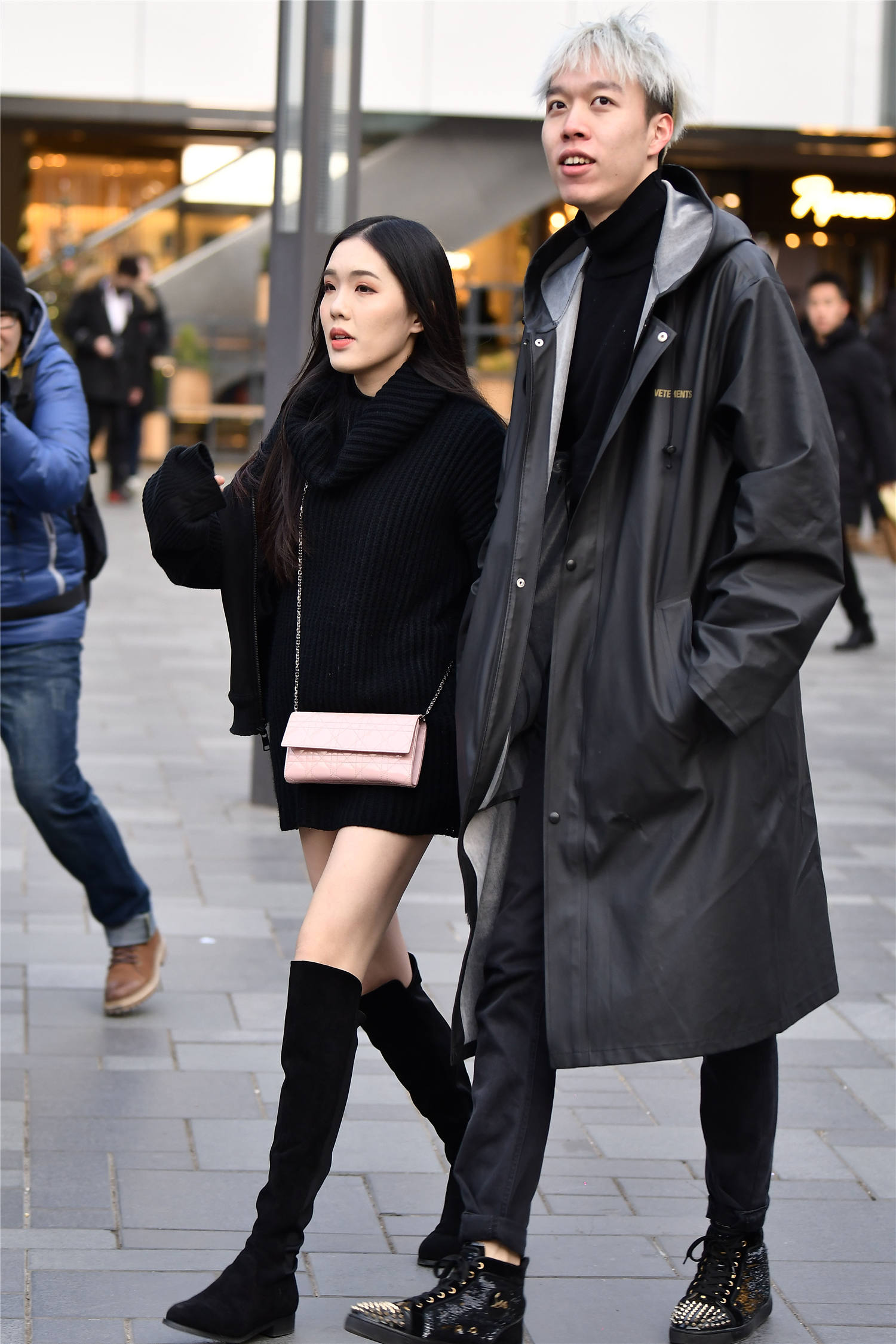 时尚的姑娘,总会有着自己的搭配想法,这位美女选择一款黑色长靴,平底的款式,靴筒也有着修身的效果,这样就搭配出自己的时尚味道,一款黑色长款的毛衣,穿出自己的时尚味道,这样就搭配出自己的时尚感觉,而且露出一点大腿的位置,非常好看,也衬托出她的精致感觉,时尚的姑娘就是会搭配自己。
