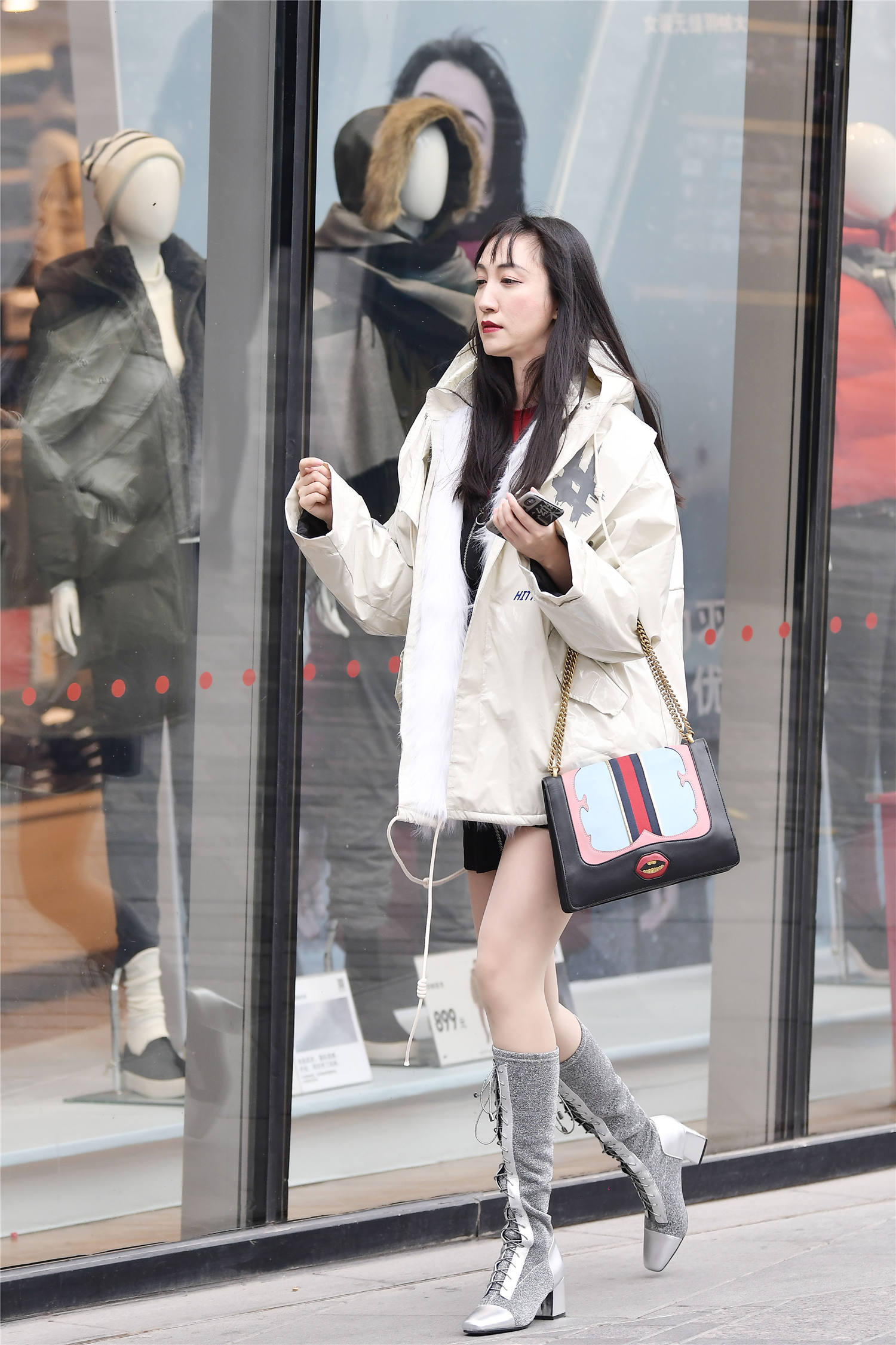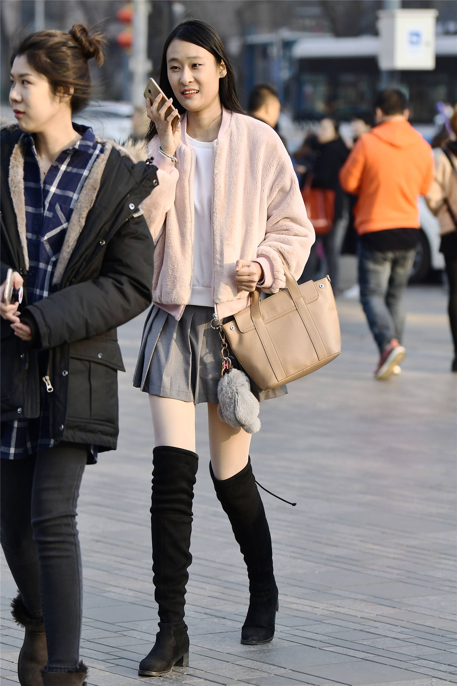 到了春天,要搭配出不怕冷的效果,还要搭配出层次感,展现出精致的感觉,看一下这位身材苗条的姑娘,她的搭配很好看,也有着层次感,黑色过膝长靴,搭配白色的打底裤,色彩对比很好,灰色的百褶裙,搭配出一些小女生的味道,白色的衬衣外面一款抓绒的短款外套,非常好看,春天就是要搭配出一点春天的味道才好。
