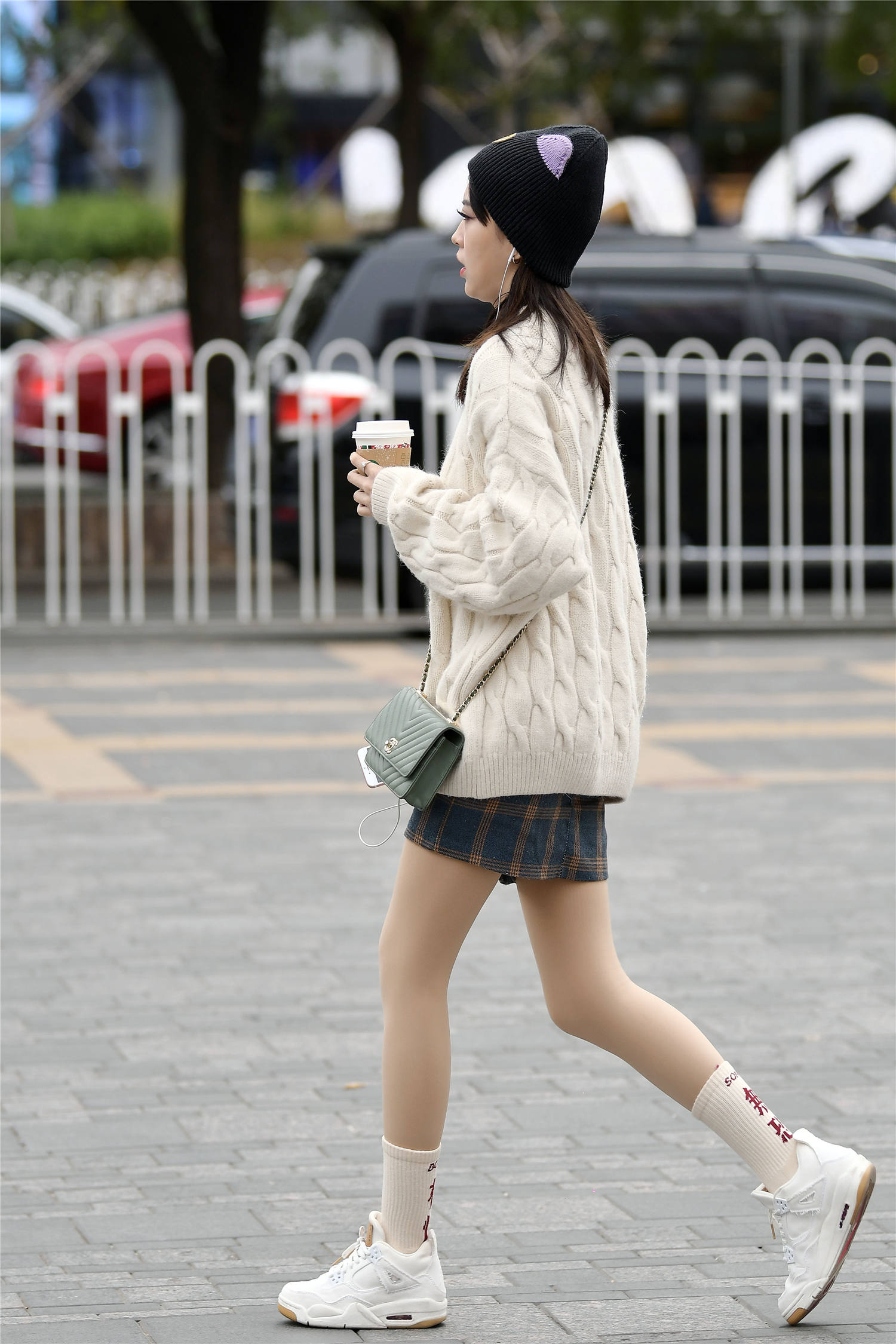 到了春天,穿搭的不多,却要很有层次感,看一下这位小姐姐的搭配,非常好看,米白色的大纹理针织毛衣,非常秀气的感觉,也搭配出小女生的感觉,一款黑色帽子的搭配,褐色格子短裙,搭配肉色打底袜,这样也搭配粗大长腿的效果,浅色的高筒袜,后面还有着汉字,装饰起来非常漂亮,搭配一双运动鞋,就穿出自己的时尚味道。