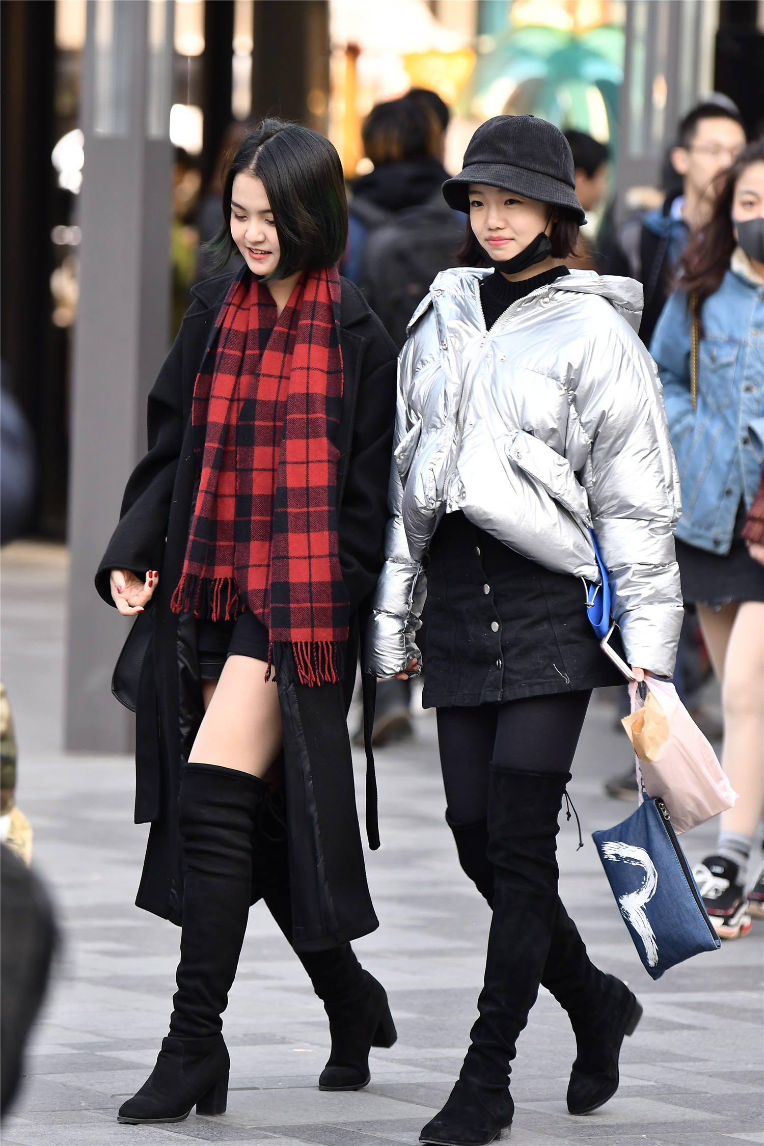 有闺蜜逛街,会是很好的选择,想要搭配出自己的味道,就要选择自己喜欢的色彩,搭配自己喜欢的味道,这位美女选择黑色搭配,黑色长靴,粗跟的款式,搭配出显瘦的效果,一款黑色风衣,敞开怀,会非常好看,一款红色格子的围巾,搭配出自己的感觉,她的姐妹穿着一款银色短款羽绒服,搭配高腰裙,一双黑色过膝长靴,穿出小女生的感觉。