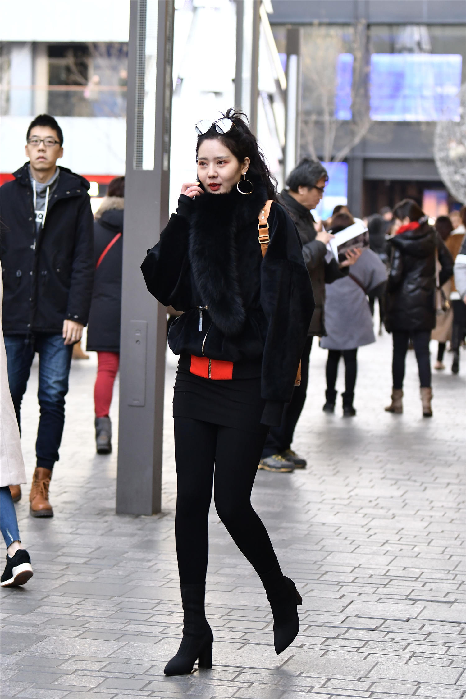 也有选择黑色搭配,还会穿出很美的姑娘,早春时间还是要穿着显身材的感觉,这位姑娘选择一款黑色打底裤,穿搭出很美,很显瘦的效果,脚下一双黑色的粗跟短靴,搭配出自己的时尚味道,黑色皮草外套,穿出显身材比例的效果,发型也是很精致的款式,这样一身黑色,穿出自己的风格,非常好看的搭配。