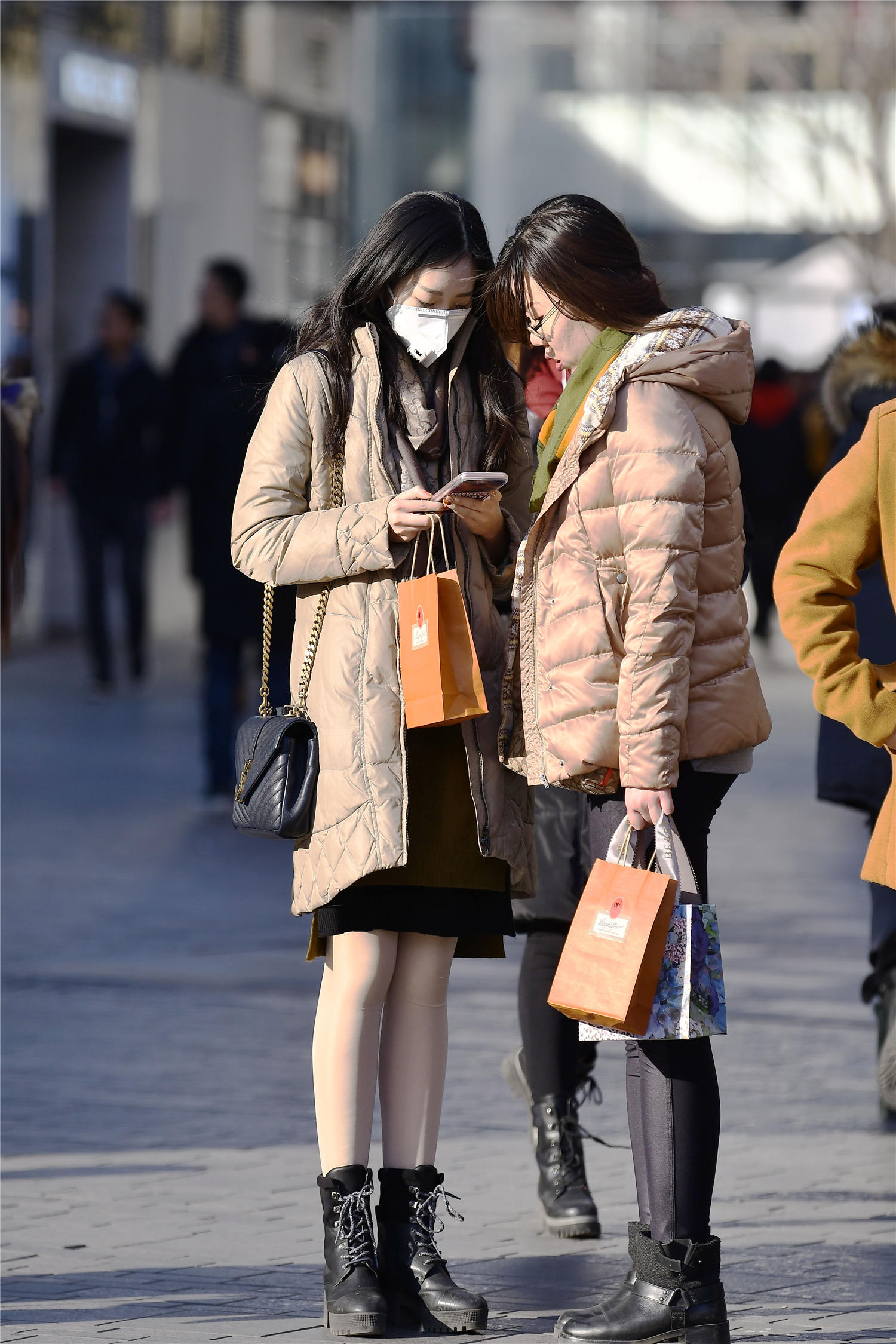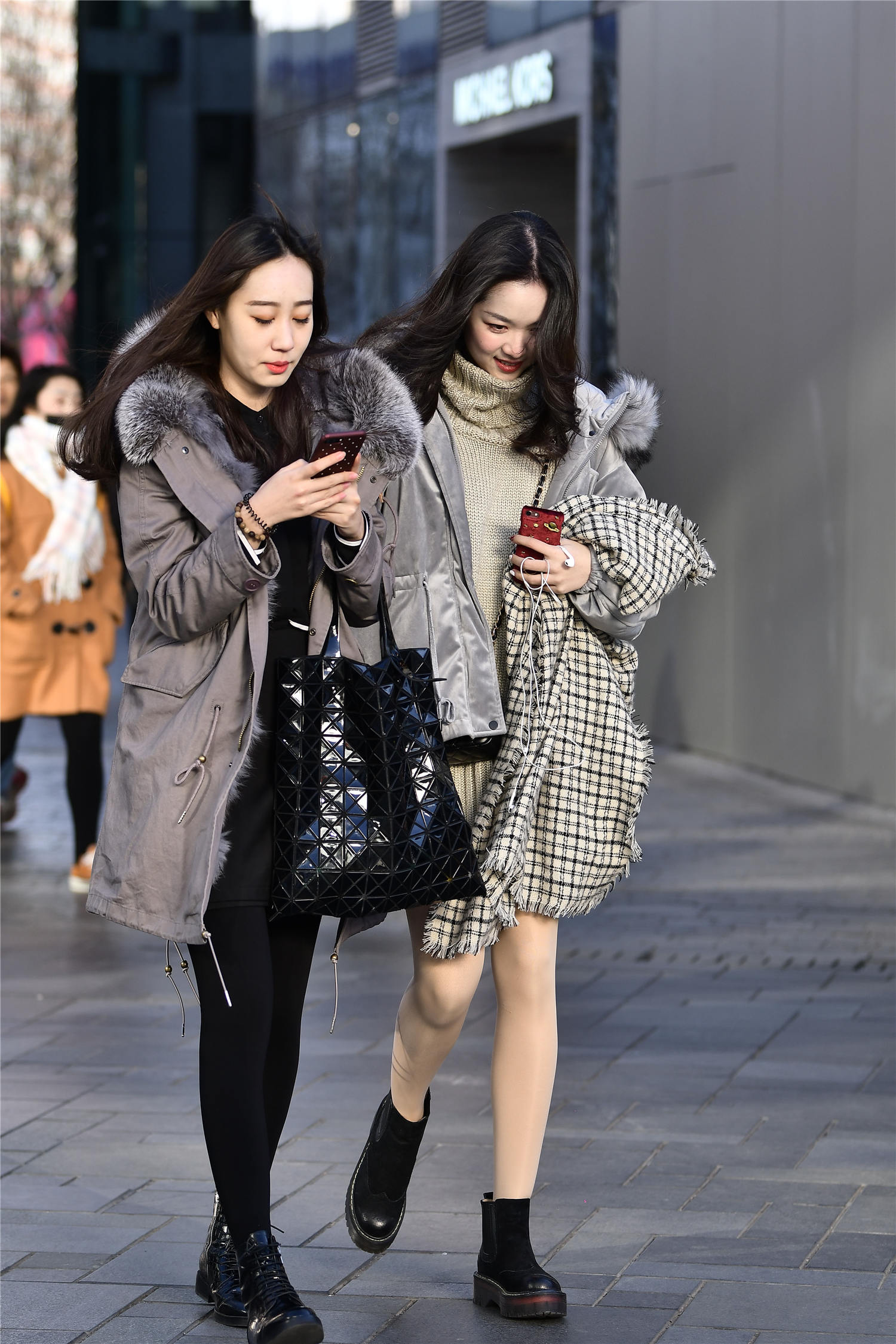 有时候会约着姐妹一起逛街,那么要搭配出自己的感觉,就要选择一些时尚漂亮的服装,也要注意保暖的穿搭,初冬时节,依旧要注意保暖,这位美女选择一款灰色中长款羽绒服,黑色短裙,搭配肉色打底裤,脚下一双黑色系带马丁靴,搭配出很有层次感,她的姐妹穿着短款羽绒服搭配黑色打底裤,一双黑色短靴,逛街会更轻松。