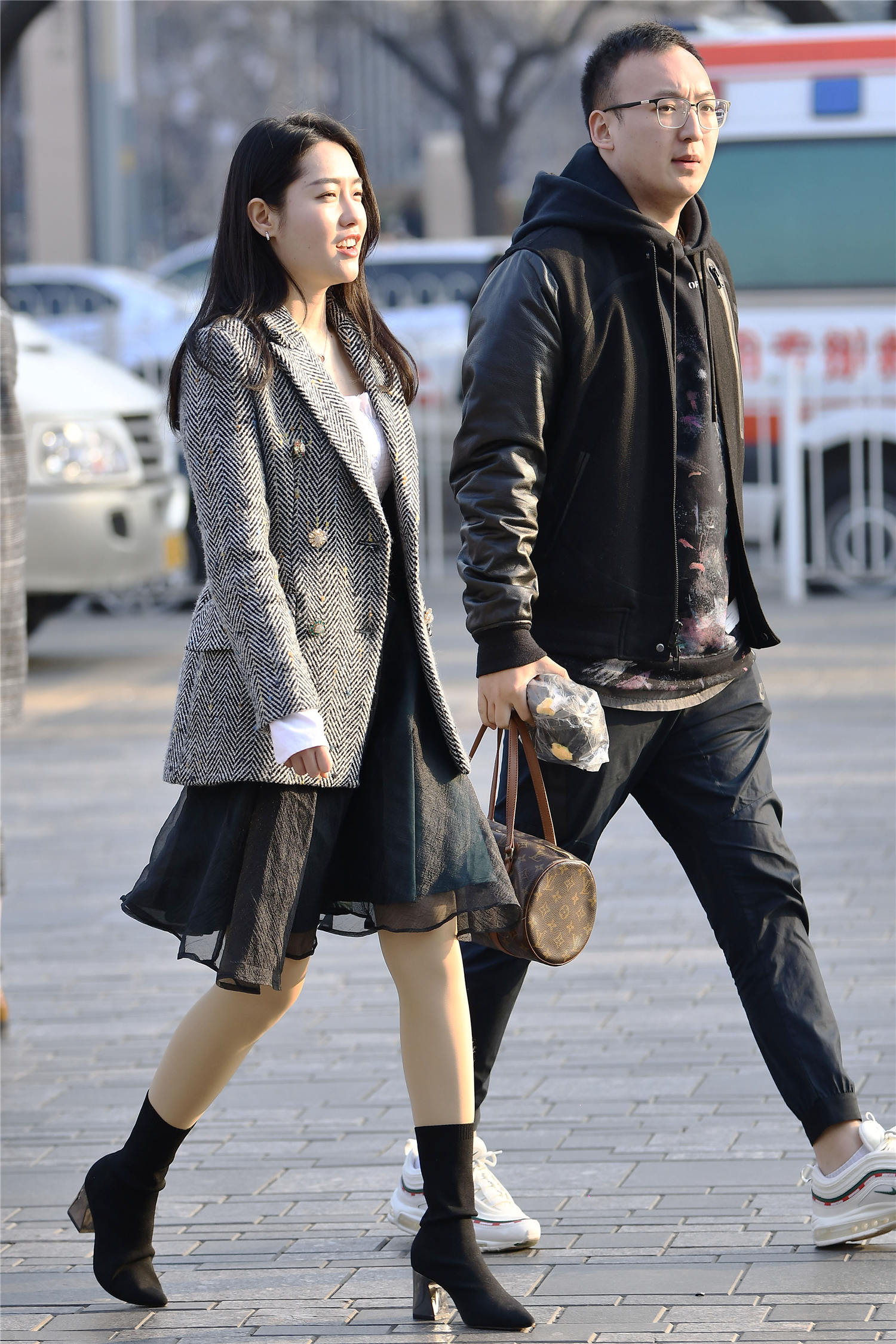 时尚的姑娘有着自己的想法,要搭配出精致的感觉,就要有自己的想法,看一下这位美女的穿搭,黑色的尖头粗跟短靴,里面一款黑色纱裙,非常漂亮,裙摆散开,非常好看,肉色的打底裤,搭配出显瘦的效果,一款灰色的短款西服,显得非常精致,也搭配出自己的感觉,有着层次感的穿搭,就是好看。