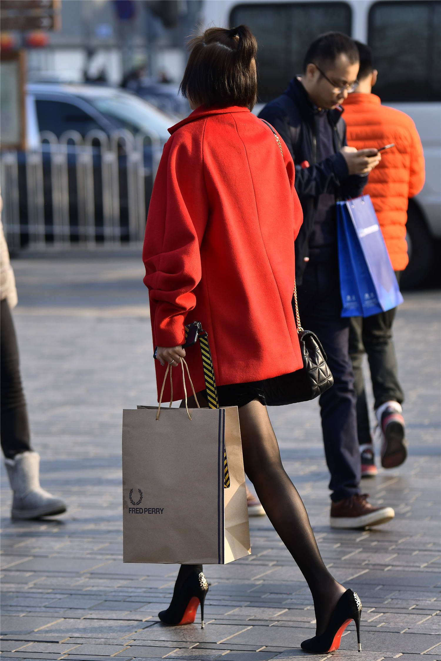 对于搭配,很多时尚姑娘有着自己的想法,也会搭配出精致的感觉,看一下这位美女的搭配,一款黑色的丝袜,在阳光下,非常有质感,也搭配出显瘦的效果,一双10厘米的尖头细跟单鞋,红色鞋底,搭配出很精致的感觉,也衬托身材高挑,小腿更显纤细修长,一款红色的中短款呢子大衣,这样的色彩对比,非常好看。