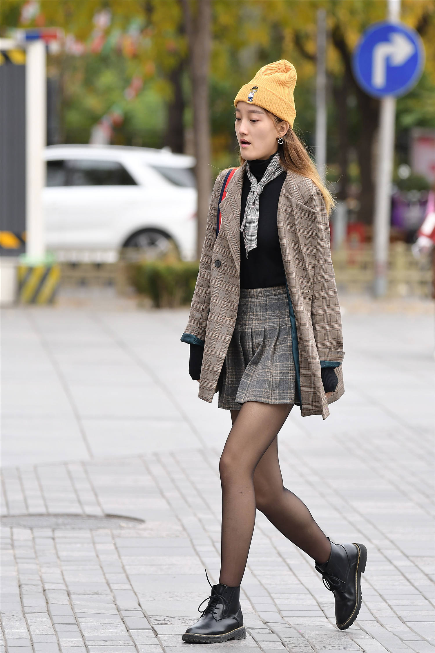黑色丝袜,对于很多姑娘来说,可以轻松搭配出自己的味道,穿出小女生的感觉,一双黑色马丁靴,搭配黑色丝袜,显得身材骨感,也有着一点保暖效果,还搭配出自己的味道,灰色的百褶裙,搭配黑色高领衫,外面的灰色格子西装,搭配出很美的感觉,领口的灰色丝带装饰,非常好看,一顶黄色的针织帽,有着自己的搭配想法。