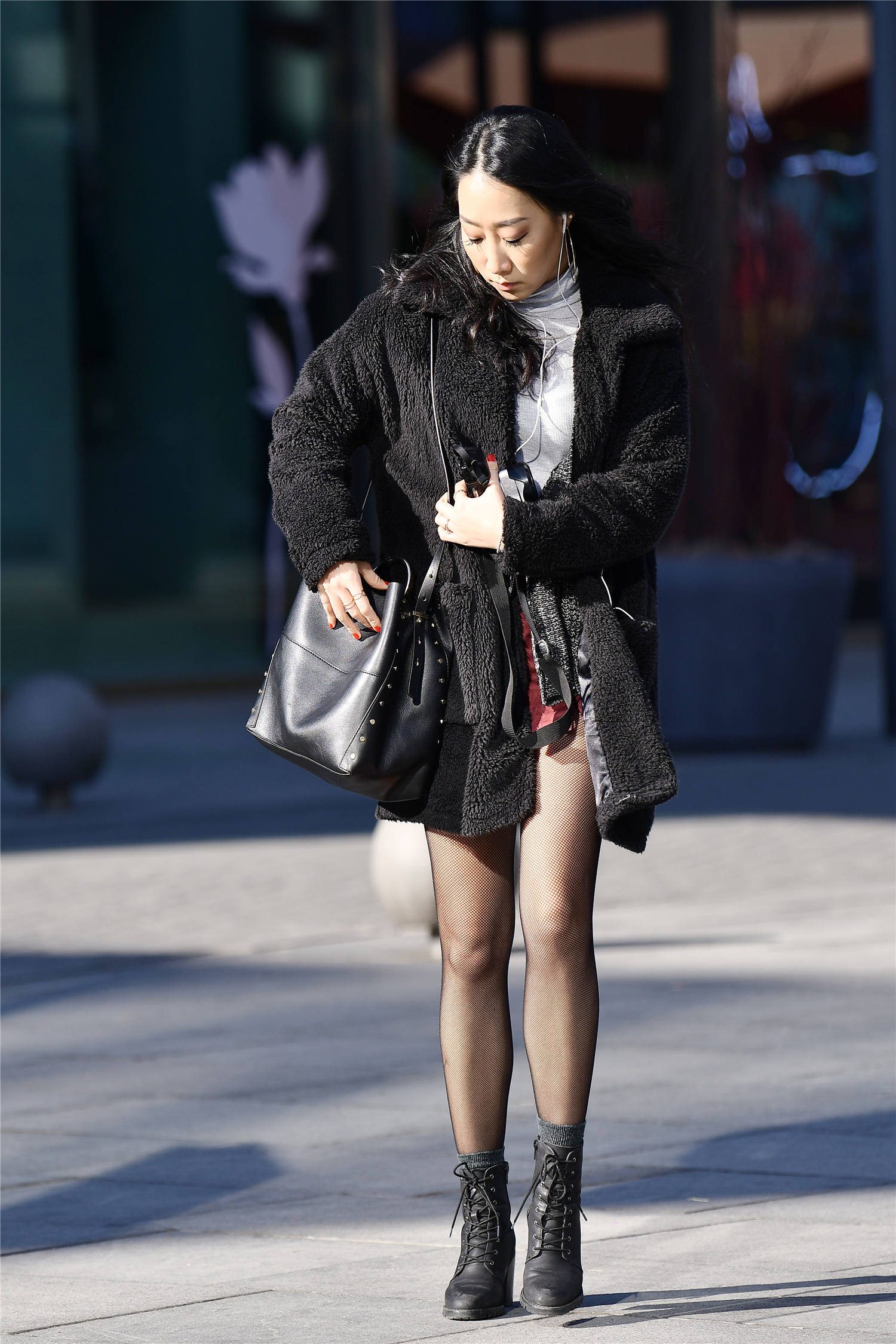 很多人喜欢黑色,也是比较容易搭配,穿出自己的感觉才是最好的,这位美女选择一款黑色的抓绒大衣,中款的设计,非常保暖,里面灰色的高领衫,显得非常保暖,细致的黑色网格丝袜,搭配出很精致的感觉,脚下黑色系带短靴,坡跟的款式,会显得身材高挑一些,也搭配出很有质感的效果。