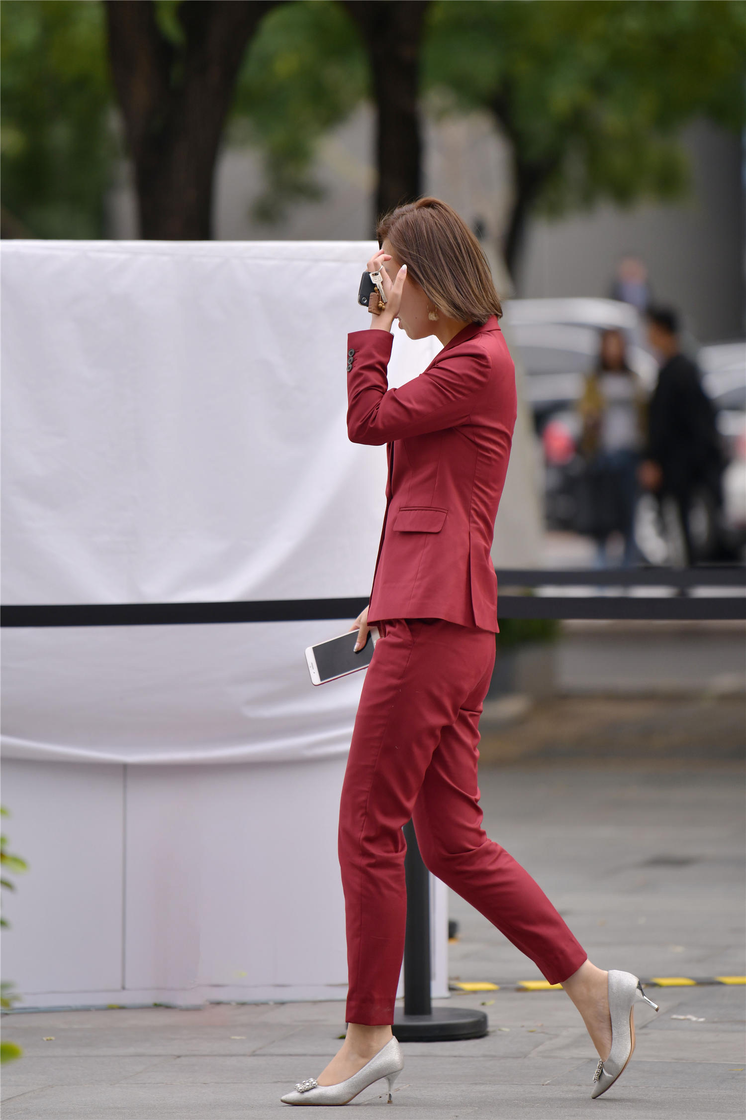 西服要搭配出时尚感觉,要知道自己适合什么搭配,选择西服的时候,也要搭配出简约的效果,色彩也要注意怎么选择,这位美女选择一款暗红色的西服和西裤,西服修身的款式非常好看,衣襟不长,露出西裤,西裤是收脚的设计,九分长度,露出脚踝,脚下的灰色尖头细跟单鞋,5厘米的细跟,走路不累,鞋尖的方扣装饰,鞋子看着不单调。