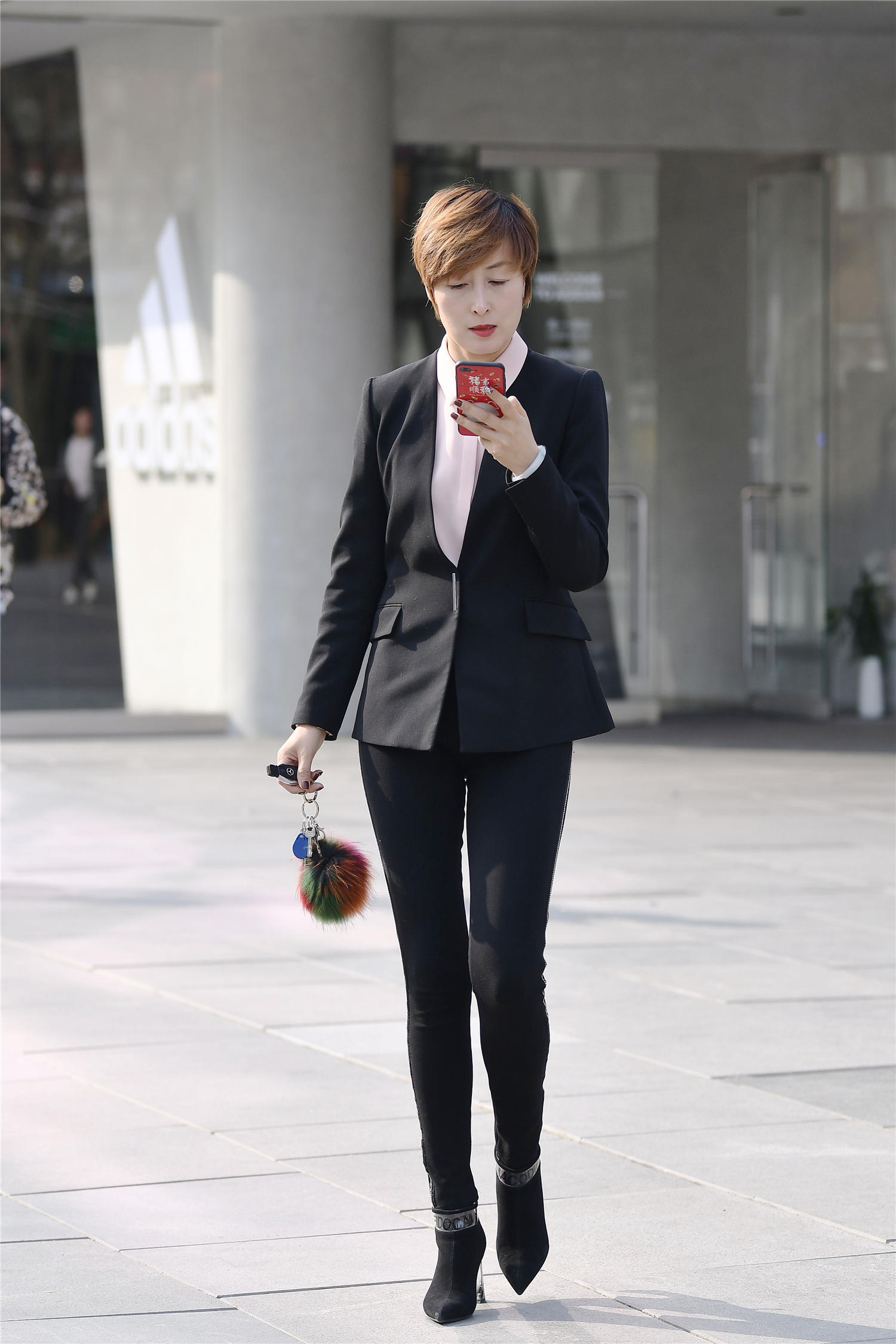 西服的搭配也有很多,穿出混搭风也是非常好看的,这位美女选择一款黑色服装,其实黑色西服很少有人穿搭,深蓝色会显得很好看,米粉色的衬衣,领口的设计,非常好看,黑色紧身裤,也是对自己身材自信的感觉,脚下一双尖头细跟短靴,衬托身材高挑,PVC靴筒设计,增加个性,也看着很美的效果。