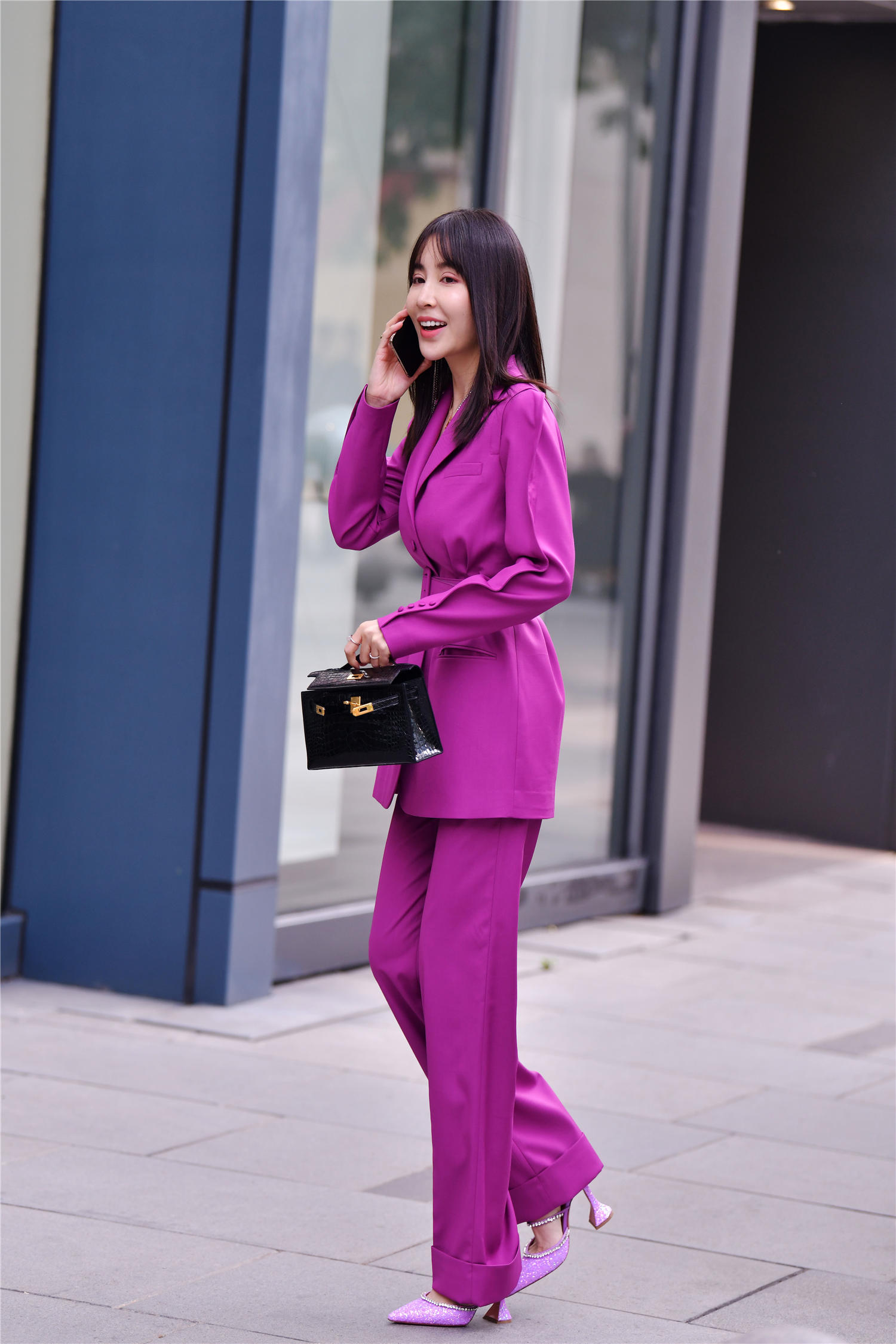 穿出精致,才是最好的,选择色彩也是很重要的,想要时尚的姑娘,可以选择西服,款式和色彩要仔细的考虑一下,这位美女选择一款紫色的西服套装,西服有着收腰的设计,销售效果很好,也搭配出骨感的味道,西裤稍微宽松一些,脚下穿着一双亮片的紫色尖头细跟鞋,酒杯的细跟,非常好看,衬托出很精致的感觉,搭配出很有色彩的感觉。