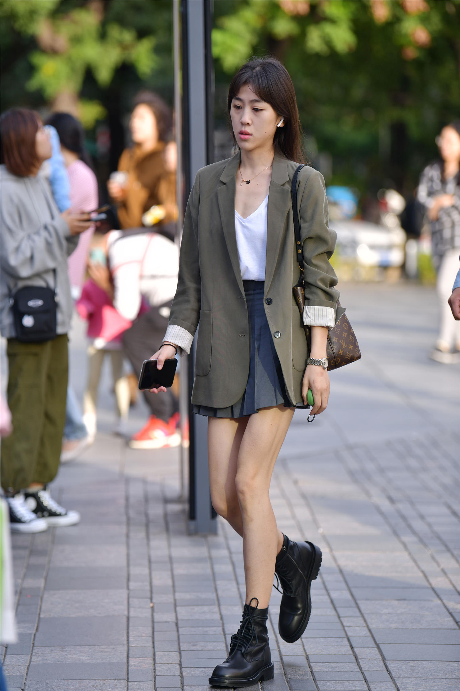 对于选择西服搭配,每一位时尚姑娘有着自己的想法,这位美女选择一款深色的休闲西服,里面搭配白色小衫,高腰的学生百褶裙,搭配出很年轻的效果,这样搭配出休闲的感觉,脚下的黑色系带马丁靴,非常个性,也有着自己的搭配味道,这样的搭配属于年轻姑娘的穿搭,也会穿出个性的感觉。
